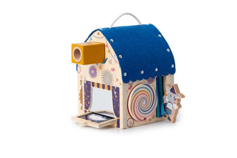 Drewniany Domek iluzjonisty belgijskiej marki Lilliputiens to niebanalna wielofunkcyjna zabawka, angażująca na wiele godzin jako wspaniałe źródło rozrywki i nauki dla ciekawskich maluszków. W skład zestawu oprócz drewnianego budynku z otwieranym filcowym dachem i oknem połaciowym w intensywnym granatowym kolorze wchodzą drewniana figurka Nosorożca Mariusa w stroju magika oraz sześcian z kalejdoskopem, który można umieścić w odpowiednim otworze w górnej części domku. Ponadto każda ze ścian stanowi nową zagadkę do odkrycia – znajdują się na nich m.in. lusterko z wysuwaną szufladką i 3 wymiennymi kartami do układania na niej, tworzącymi ciekawe odbicia, obracane koło z efektem złudzenia optycznego, wnęka z filcowymi paskami, w której można (jak za kulisami) ukryć magika, ilustracja z przesuwaną czerwoną folią, dzięki której przedmioty na obrazku pojawiają się i znikają, drzwi z postacią żonglującego piłeczkami kościotrupa i otworem na buzię, okienko z postacią wróżki – Krówki Rosalie w turbanie, która wdzi przyszłość w kartach, a w swojej szklanej kuli obserwuje różne przedmioty (pojawiają się w efekcie obracania kółka w bocznej ściance) Zabawka jest solidnie wykonana i bezpieczna. Zachwyca kolorami, zaskakuje i pobudza dziecięcą wyobraźnię, zachęca do snucia opowieści, odgrywania ról lub odtwarzania sytuacji. Rozwija koordynację ręka-oko i małą motorykę (chwytanie, obracanie, przesuwanie, wkładanie, wyjmowanie, zamykanie, otwieranie), aktywizuje zmysł wzroku i dotyku.