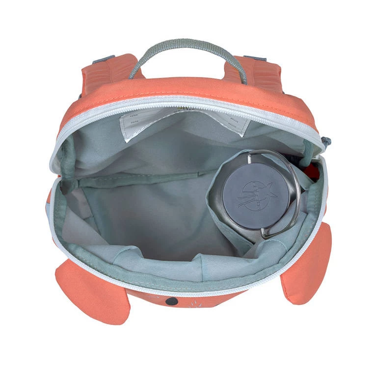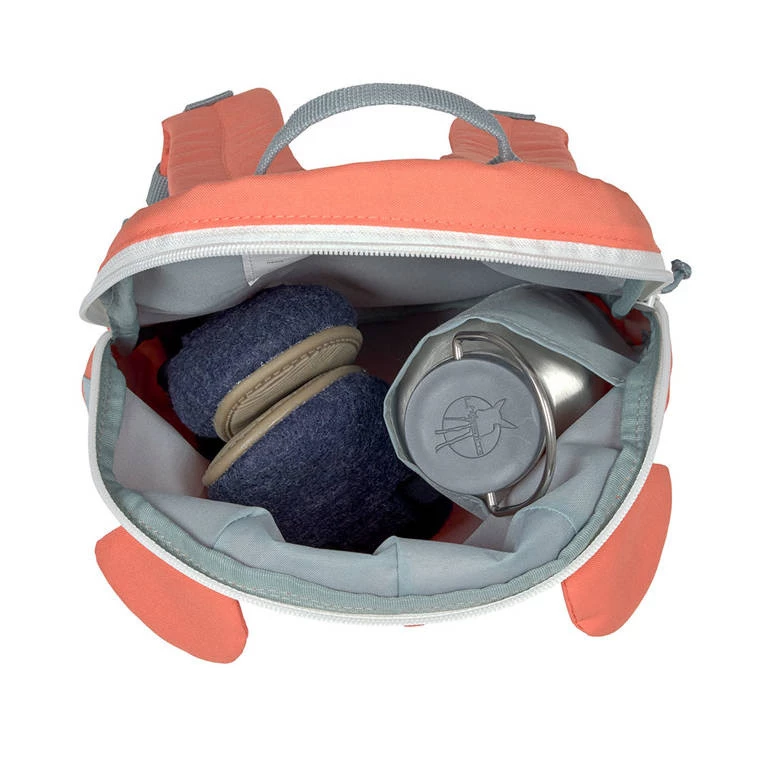Wyjątkowo uroczy plecaczek 3D w kształcie myszki niemieckiej marki LASSIG. Funkcjonalny, lekki i wygodny, idealny dla maluchów już od 2. roku życia, do przedszkola i na krótkie wycieczki. Myszka ma piękny koralowy kolor, zaokrąglone uszka, futerko, pyszczek z długimi wąsikami oraz uroczy ogonek. Dość przestronna komora główna zapinana jest na suwak, posiada wewnętrzną kieszeń na butelkę z napojem oraz etykietkę z wizytówką, na której można zapisać imię dziecka i numer kontaktowy rodzica. Plecak uszyto z wysokiej jakości, trwałych materiałów, tylna ścianka jest lekko wzmocniona, ale nadal miękka w kontakcie z plecami dziecka. W górnej części znajduje się uszko do zawieszenia plecaka, np. na haczyku w szatni. Dość szerokie, grubsze i miękkie ramiączka zapewniają wygodę noszenia. Z przodu, na klatce piersiowej dodatkowo wyposażone są z w stabilizujące i odciążające plecy zapięcie na zatrzask – jego wysokość, podobnie jak długość ramiączek, można regulować i na bieżąco dopasowywać do wzrostu dziecka. Uszko, paski oraz ułatwiające dziecku samodzielne zapinanie sznureczki przy suwakach mają kolor bladoniebieski. Materiał plecaka łatwo się czyści i jest odporny na wilgoć.