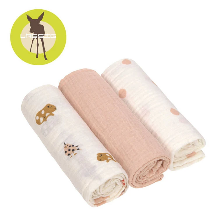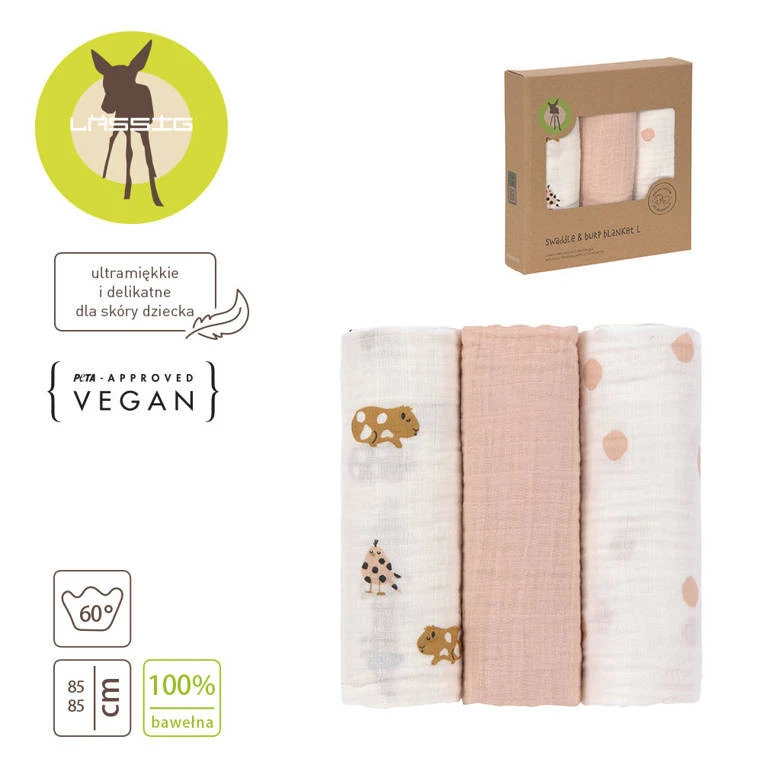 Komplet trzech wielofunkcyjnych bawełnianych otulaczy z kolekcji Little Mateys niemieckiej marki LASSIG. Jeden w ciepłym odcieniu melanżowego pudrowego różu, drugi kremowy ze wzorem w grochy, a trzeci z grafiką zabawnych domowych pupili: łaciatym jamnikiem, świnką morską w ciapki czy nakrapianym gołębiem (niektóre wzorki na zwierzakach są pomarańczowe). Kocyki mają spore rozmiary – 85x85 cm – i mogą być używane np. do owijania maluszka, jako pieluszka do odbijania po karmieniu, okrycie podczas letniej drzemki, osłona do wózka, jako prześcieradełko, chusta do karmienia i na wszelkie inne sposoby według potrzeb. Są jednowarstwowe, przewiewne i delikatne dla skóry. Dzięki kompletowi 3 sztuk rodzic ma potrzebny otulacz zawsze pod ręką.