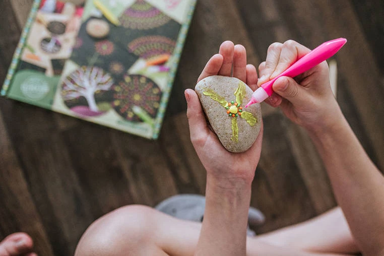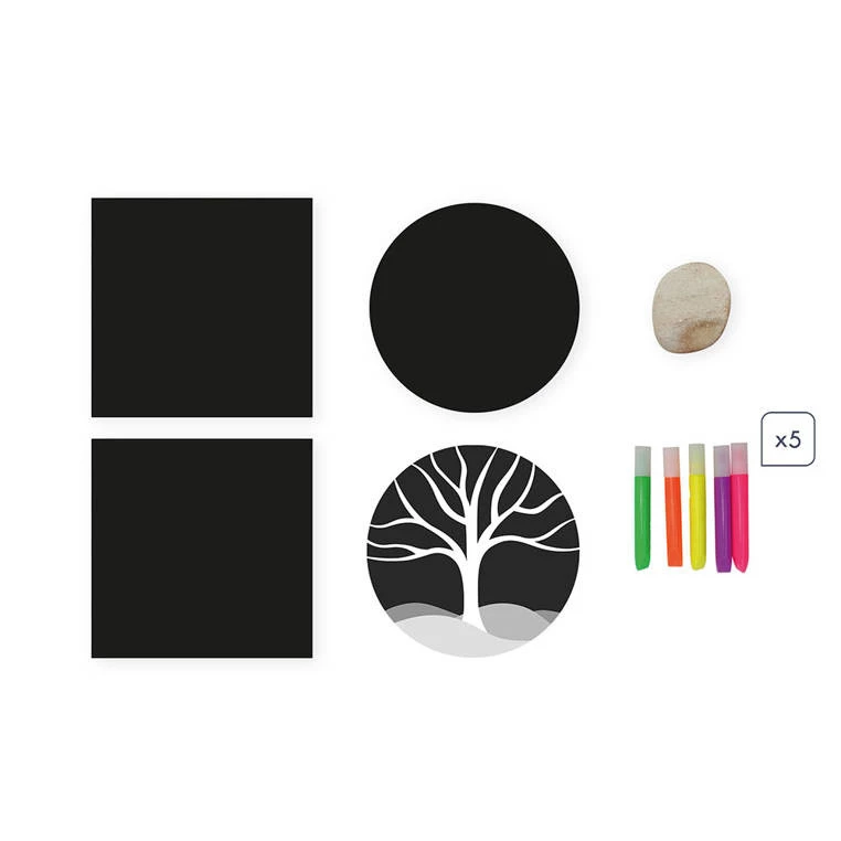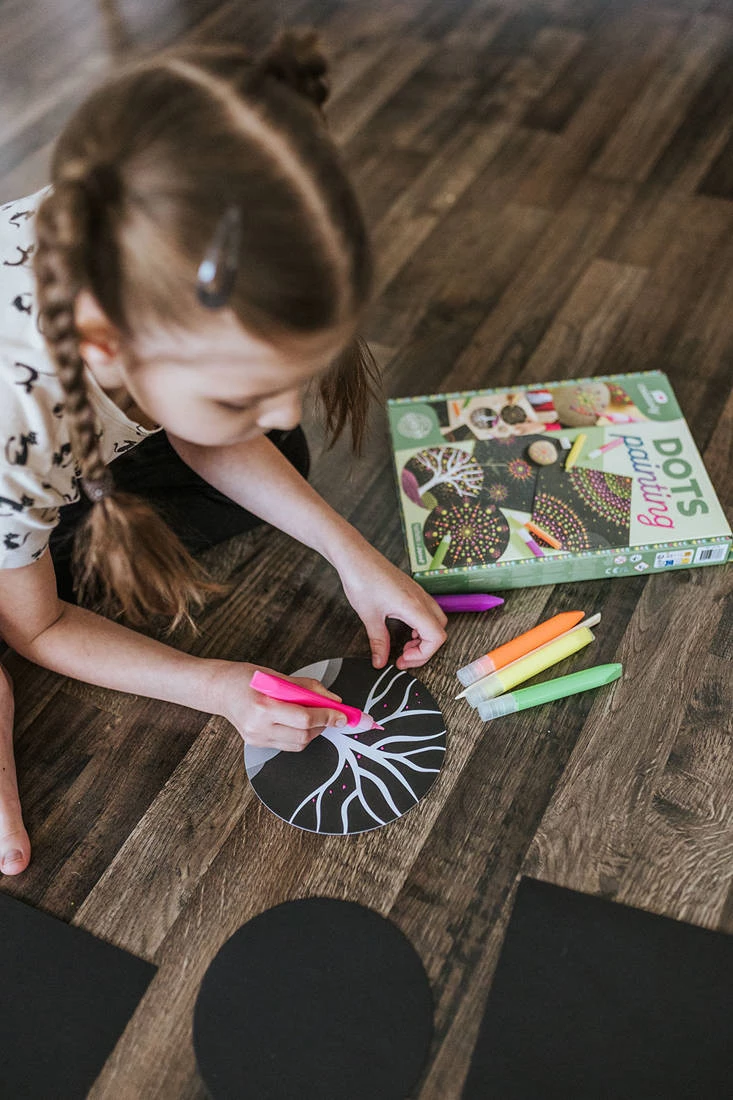 Zestaw kreatywny do malowania kropkami z serii I love creativity francuskiej marki JANOD zawiera 5 projektów do wykonania – dwa kwadratowe obrazki z czarnym tłem, dwa okrągłe czarne obrazki (jeden z zarysem wzoru) oraz jeden płaski kamień do ozdobienia. W komplecie znajduje się 5 tubek z farbami w neonowych kolorach: fioletowym, różowym, pomarańczowym, żółtym i zielonym, ze specjalnymi końcówkami do robienia kropek. Ponadto sprytne opakowanie zestawu może stać się ramką 3D dla skończonego obrazka. Malowanie techniką kropek to dla dziecka długie godziny angażującej i jednocześnie uspokajającej, wyciszającej zabawy, a gotowe dzieła zapewnią emocjonującą rozrywkę dla kilkorga dzieci, a nawet dla dorosłych. Zestaw zaprojektowano we Francji. Idealnie nadaje się na prezent.