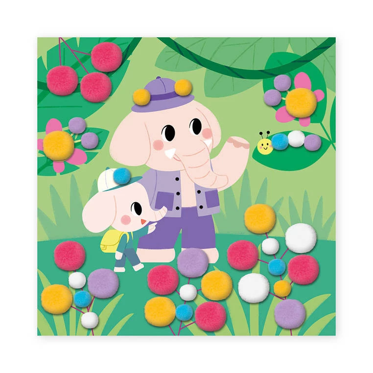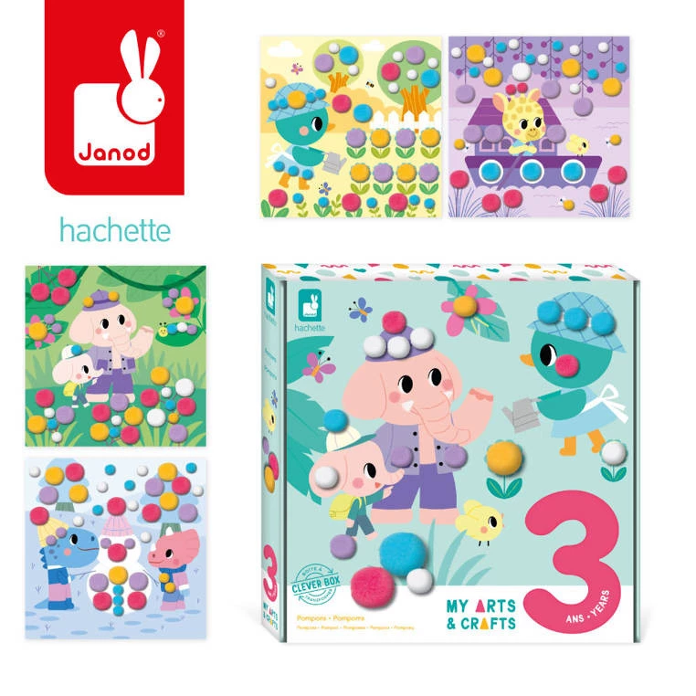 Zestaw kreatywny Pompony francuskiej marki JANOD zawiera 4 plansze-obrazki, przedstawiające różne zwierzątka w nietypowych sytuacjach: płynące łodzią żyrafy, podlewającą rabatę kaczuszkę, budujące bałwana dinozaury oraz słonie na wycieczce w lesie. Ilustracje te można ozdobić, naklejając – w wyznaczonych miejscach – kolorowe pompony. W komplecie znajduje się 150 takich aplikacji w dwóch wielkościach i 5 kolorach. Ponadto sprytne opakowanie zestawu może stać się ramką 3D dla skończonego obrazka. Zdobienie to dla dziecka długie godziny angażującej i jednocześnie uspokajającej, wyciszającej zabawy, a gotowe obrazki staną się wspaniałym elementem dekoracyjnym dziecięcego pokoju. Zestaw zaprojektowano we Francji. Idealnie nadaje się na prezent.