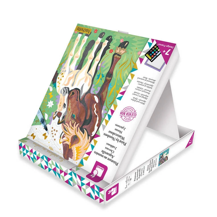 Zestaw kreatywny Malowanie po numerach Konie francuskiej marki JANOD zawiera 2 plansze-obrazki z tymi stworzeniami. Plansze są białe (jedna ma wyróżnione złote elementy), podzielone na ponumerowane przestrzenie, a ilustracja ujawnia się na nich dopiero w trakcie malowania. Zadanie polega na precyzyjnym – za pomocą dołączonego specjalnego cienkiego pędzelka ze zbiornikiem wody – wypełnieniu przestrzeni farbą, zgodnie z instrukcją numeryczną. W palecie akwareli znajduje się 15 kolorów i mała gąbka do pochłaniania nadmiaru wody. Sprytne opakowanie może stanowić sztalugę pod obrazek. W komplecie jest też ramka na skończony obrazek, którą również można pomalować na wybrany kolor. Malowanie po numerach to dla dziecka godziny angażującej i jednocześnie uspokajającej, wyciszającej zabawy, a gotowe obrazki staną się wspaniałą dekoracją dziecięcego pokoju.
