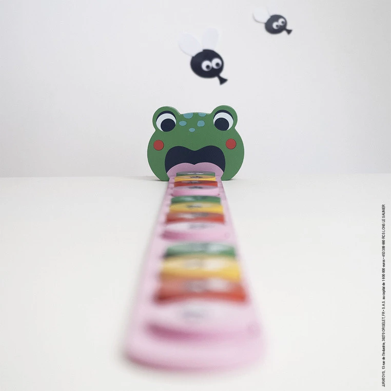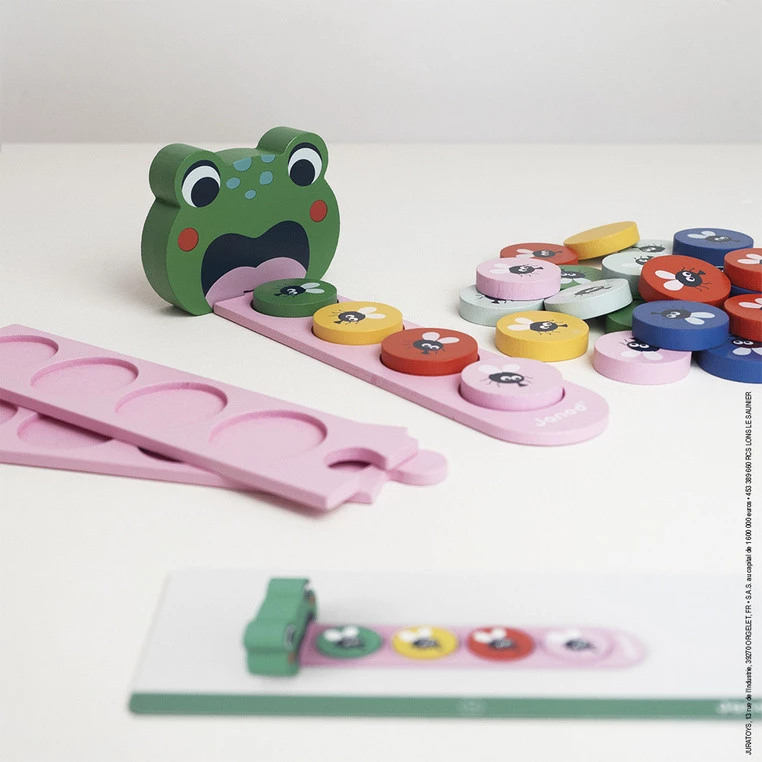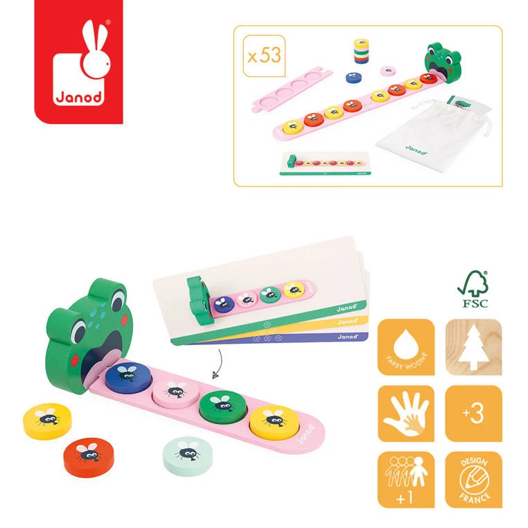 Drewniana układanka logiczna Algorytmy Żaba francuskiej marki JANOD to idealna zabawka edukacyjna dla dzieci od 3. roku życia. Pomoże ona maluchom zrozumieć zależności przyczynowo-skutkowe i ciągi logiczne. Zestaw składa się z drewnianej głowy żaby i trzech podstawek, tworzących jej język. Na kolejnych etapach trudności części języka można ze sobą łączyć, tworząc coraz dłuższe sekwencje. W żabim menu jest 36 pysznych much w różnych kolorach. Zadaniem dzieci jest odtwarzanie za ich układów, wskazanych na 12 dwustronnych kartach. Mają one trzy poziomy trudności. Zabawka rozwija umiejętność obserwacji i logicznego myślenia, ostrość wzroku i rozróżnianie kolorów.