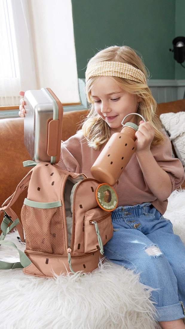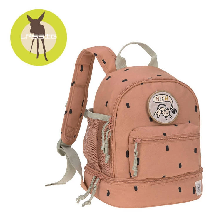 Funkcjonalny, uroczy plecak niemieckiej marki LASSIG. Sprawdzi się zarówno do przedszkola, jak i podczas wycieczek. Jest lekki, wygodny, o optymalnej pojemności 6,5l. Zwraca uwagę niebanalną kolorystyką – materiał plecaczka ma ciepły pastelowy odcień karmelu w urocze czarne ciapki, detale zaś, m.in. rączka czy ozdobne sznureczki przy suwakach, są kontrastowe – oliwkowe. Plecak posiada pojemną komorę główną. Wewnątrz znajduje się karabińczyk, np. do zawieszenia kluczy lub dołączonej do plecaczka saszetki - piórnika (w kolorach plecaczka) oraz wizytówka, na której można zapisać imię dziecka i numer kontaktowy rodzica. Wnętrze ma piękną szarą podszewkę z geometrycznym multiprintem. Z przodu plecaczka znajduje się mniejsza kieszeń na suwak, a na jego spodzie – dodatkowa, pojemna komora, również na suwak – w której z łatwością zmieści się pudełko na lunch czy obuwie na zmianę. Boczna kieszonka z siatki to z kolei idealne miejsce na butelkę z napojem. Na drugim boku umieszczono dodatkowy uchwyt, np. na ulubiony breloczek. Plecak uszyto z wysokiej jakości, trwałych materiałów, tylna ścianka jest lekko wzmocniona, ale pozostaje miękka w kontakcie z plecami dziecka. W górnej części znajduje się spore, solidne uszko do zawieszenia plecaka, np. na haczyku w szatni. Ramiączka – dość szerokie, grubsze i miękkie – zapewniają wygodę noszenia, dodatkowo wyposażone są w stabilizujące i odciążające plecy zapięcie na zatrzask z przodu, na klatce piersiowej – jego wysokość, podobnie jak długość ramiączek, można regulować i na bieżąco dopasowywać do wzrostu dziecka. Na obu ramiączkach umieszczono odblaski, by zapewnić dziecku lepszą widoczność po zmroku. Materiał plecaka łatwo się czyści i jest odporny na wilgoć. W zestawie znajduje się urocza okrągła przypinka z kotkiem.