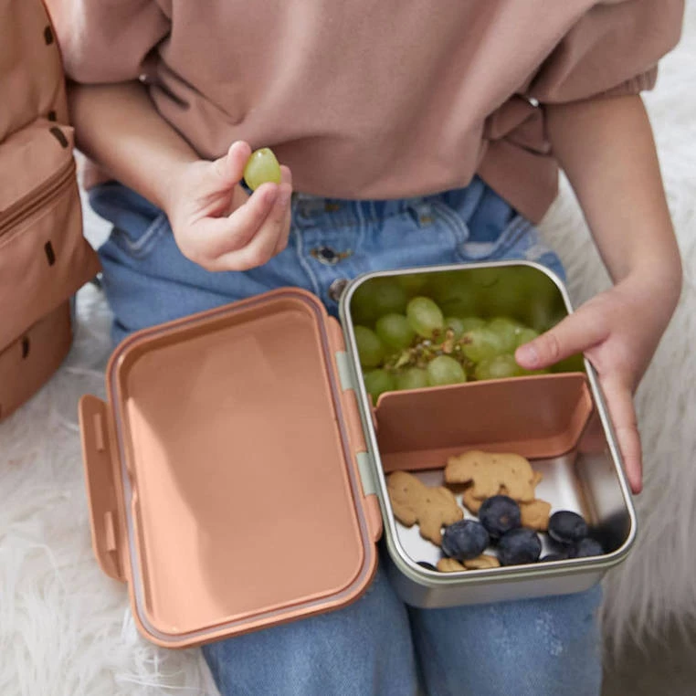 Solidne pudełko śniadaniowe ze stali nierdzewnej niemieckiej marki LASSIG przyda się nie tylko do szkoły, ale również podczas rodzinnych spacerów i wycieczek. Jest pojemne i posiada ruchomą przegrodę, dzięki której można je podzielić na dwie części, np. większą na kanapki, a mniejszą na owoce, krojone warzywa czy inne przekąski. Silikonowa uszczelka wokół pokrywki zapewnia pojemnikowi szczelność, a zamknięcie na szeroki klips uniemożliwia jego samoczynne otwarcie. Pudełko ma ergonomiczny kształt, zmieści się nawet do małego plecaka. Stalowy lunchbox ma pokrywkę i przegrodę w pastelowym, ciepłym odcieniu karmelu, oliwkową uszczelkę i urocze czarne ciapki na zewnętrznej stronie wieczka.