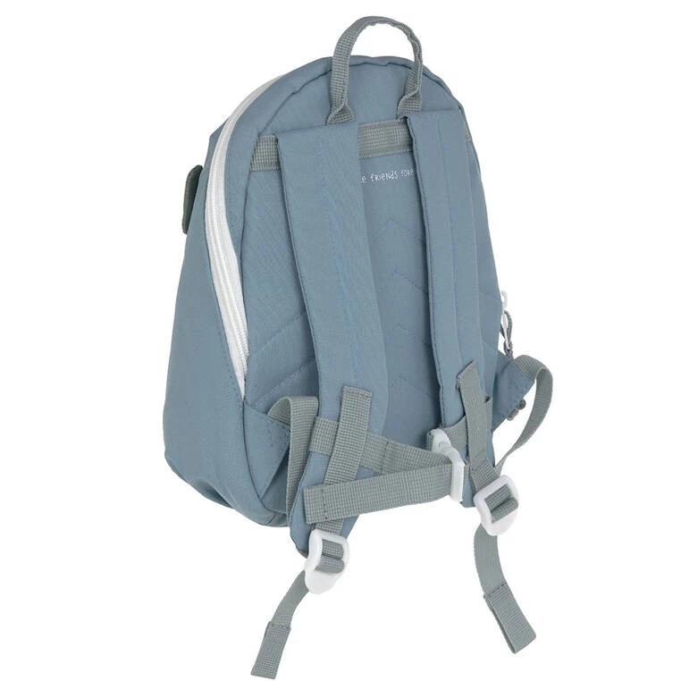 Uroczy plecaczek z Traktorem niemieckiej marki LASSIG. Funkcjonalny, lekki i wygodny, idealny dla maluchów już od 2. roku życia, do przedszkola i na krótkie wycieczki. Ma ciemny grafitowo-zielony kolor i aplikację sympatycznego traktorka w kolorze oliwkowym na froncie. Niektóre elementy pojazdu są 3D – wypukłe (lusterka boczne), co przyciąga uwagę i zawsze podoba się dzieciom. Komora główna zapinana jest na suwak, posiada wewnętrzną kieszeń na butelkę z napojem oraz etykietkę z wizytówką, na której można zapisać imię dziecka i numer kontaktowy rodzica. Plecak uszyto z wysokiej jakości, trwałych materiałów, tylna ścianka jest lekko wzmocniona, ale nadal miękka w kontakcie z plecami dziecka. W górnej części znajduje się uszko do zawieszenia plecaka, np. na haczyku w szatni. Dość szerokie, grubsze i miękkie ramiączka zapewniają wygodę noszenia. Z przodu, na klatce piersiowej dodatkowo wyposażone są w stabilizujące i odciążające plecy zapięcie na zatrzask – jego wysokość, podobnie jak długość ramiączek, można regulować i na bieżąco dopasowywać do wzrostu dziecka. Uszko, paski oraz ułatwiające dziecku samodzielne zapinanie sznureczki przy suwaku mają kolor bladoniebieski, suwak, zatrzaski i elementy regulacji są białe. Materiał plecaka łatwo się czyści i jest odporny na wilgoć.