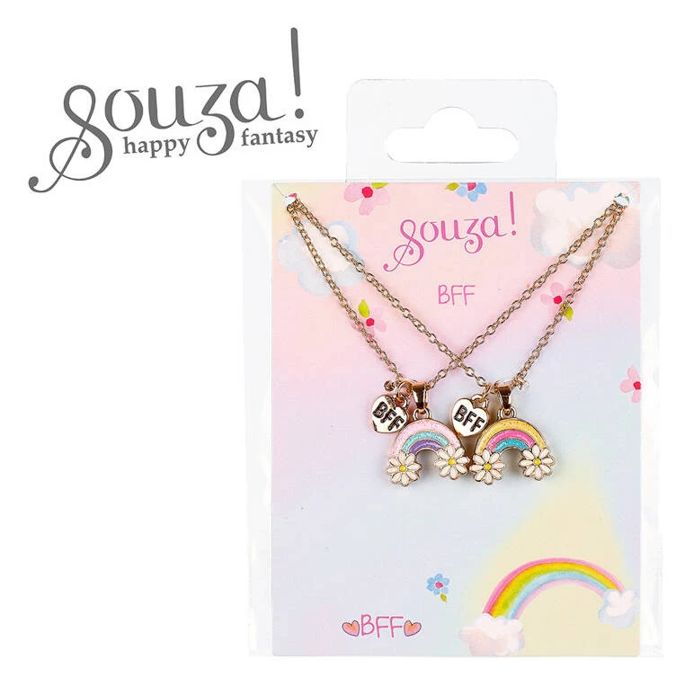 Zestaw 2 naszyjników przyjaźni BFF Tęcza holenderskiej marki Souza!, w skład którego wchodzą dwa złote łańcuszki o długości 36 cm z metalowymi zawieszkami – kolorową tęczą ze stokrotkami i białym serduszkiem z napisem BFF. Seria BFF (best friends forever) to biżuteria przeznaczona dla przyjaciółek, które chcą nosić analogiczne ozdoby. Jest nietoksyczna i nie podrażnia skóry. Idealna jako stylowy prezent.