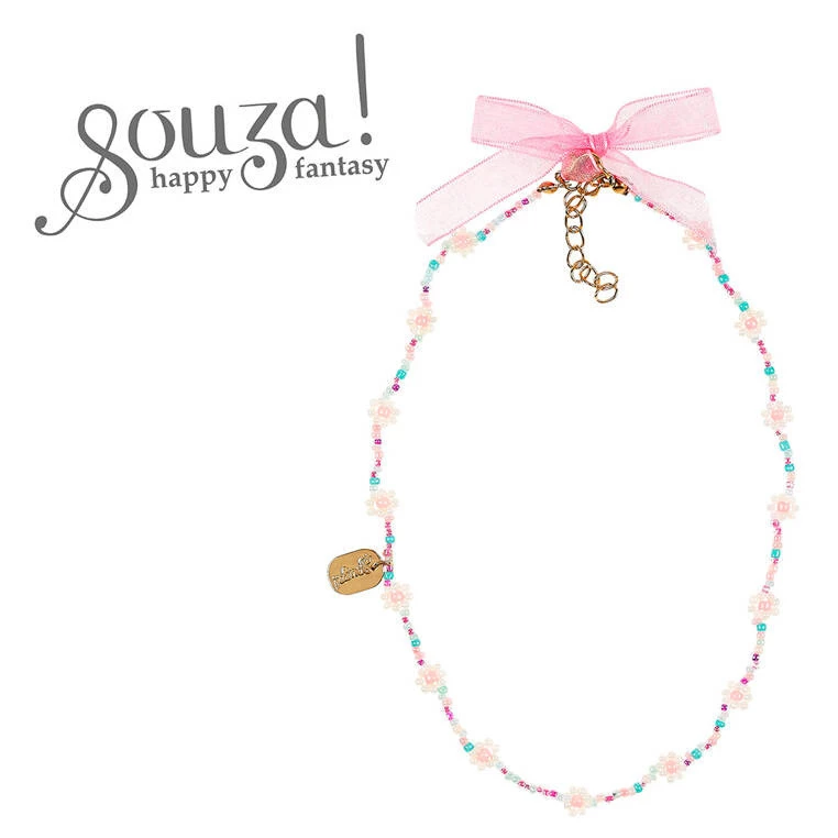 Naszyjnik Liene holenderskiej marki Souza! składa się z drobnych perełek i koralików w kolorach: białym, jaśniejszych i ciemniejszych odcieniach różowego i turkusu. Przy zapięciu ma łańcuszek z szerszymi oczkami, dzięki czemu jego długość można regulować. Naszyjnik zdobią także perłowe kwiatki, różowa tiulowa kokardka i złota zawieszka – blaszka z logo marki. Biżuteria jest lekka, delikatna, nietoksyczna i nie podrażnia skóry. Idealna zarówno na przyjęcia, jak i na co dzień. Sprawdzi się jako stylowy prezent.