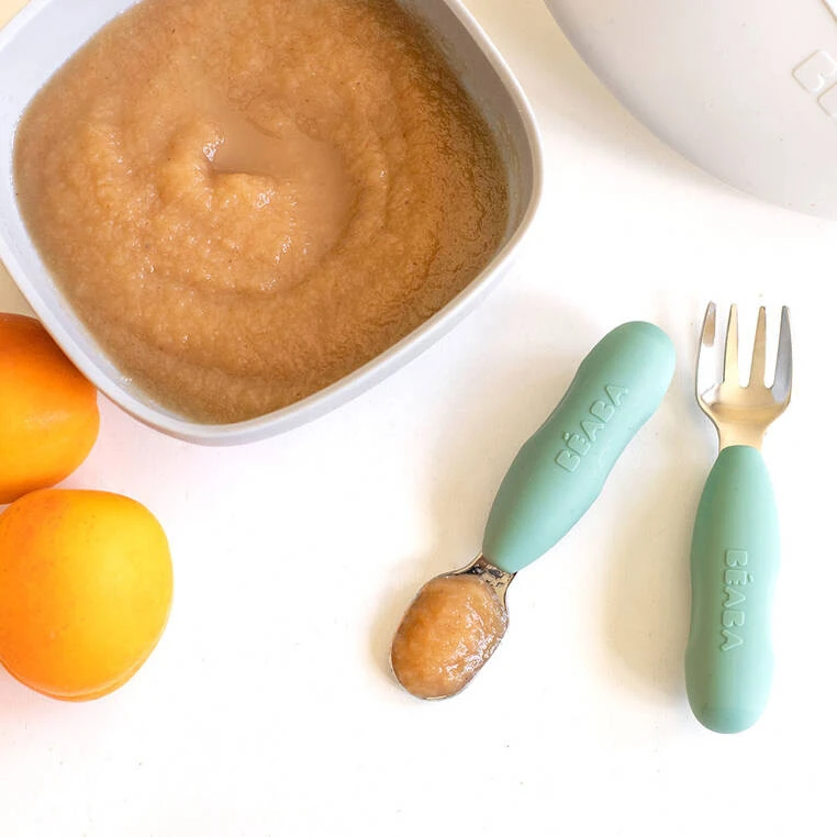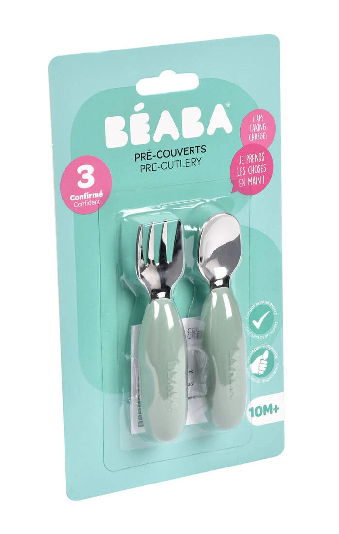 Zestaw innowacyjnych ergonomicznych pierwszych sztućców francuskiej marki BEABA zaprojektowany pod okiem specjalistów od żywienia niemowląt, aby wspierać rozwój i samodzielność maluszków. Łyżeczka i widelec wykonane zostały ze stali nierdzewnej, a ich uchwyt z elastycznego silikonu, w pełni bezpiecznego maluszka. Spłaszczony kształt łyżeczki zapewnia nabieranie optymalnych, małych porcji, dogodnych do połknięcia dla maluszka, widelec zaś ma krótkie, obłe ząbki dla maksymalnego bezpieczeństwa. Ponieważ sztućce są tak samo zbudowane i wyprofilowane z obu stron, nie trzeba ich obracać. Niedługi, zaokrąglony uchwyt z bocznymi wgłębieniami sprawia, że wspierają naukę samodzielnego chwytu już od 10. miesiąca życia (np. dłoniowy, pęsetowy i pięściowy). Nadają się zarówno dla dzieci prawo, jak i leworęcznych.
