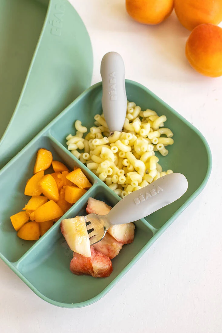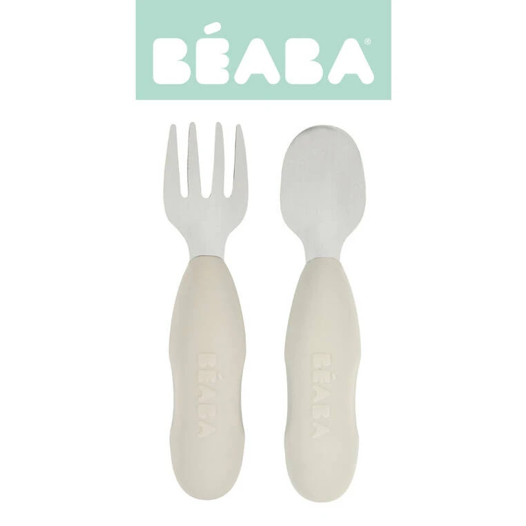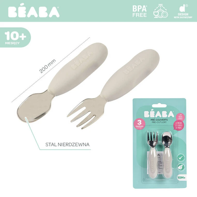 Zestaw innowacyjnych ergonomicznych pierwszych sztućców francuskiej marki BEABA zaprojektowany pod okiem specjalistów od żywienia niemowląt, aby wspierać rozwój i samodzielność maluszków. Łyżeczka i widelec wykonane zostały ze stali nierdzewnej, a ich uchwyt z elastycznego silikonu, w pełni bezpiecznego maluszka. Spłaszczony kształt łyżeczki zapewnia nabieranie optymalnych, małych porcji, dogodnych do połknięcia dla maluszka, widelec zaś ma krótkie, obłe ząbki dla maksymalnego bezpieczeństwa. Ponieważ sztućce są tak samo zbudowane i wyprofilowane z obu stron, nie trzeba ich obracać. Niedługi, zaokrąglony uchwyt z bocznymi wgłębieniami sprawia, że wspierają naukę samodzielnego chwytu już od 10. miesiąca życia (np. dłoniowy, pęsetowy i pięściowy). Nadają się zarówno dla dzieci prawo, jak i leworęcznych.