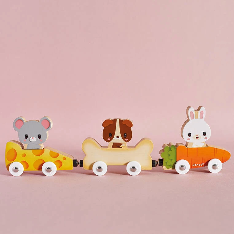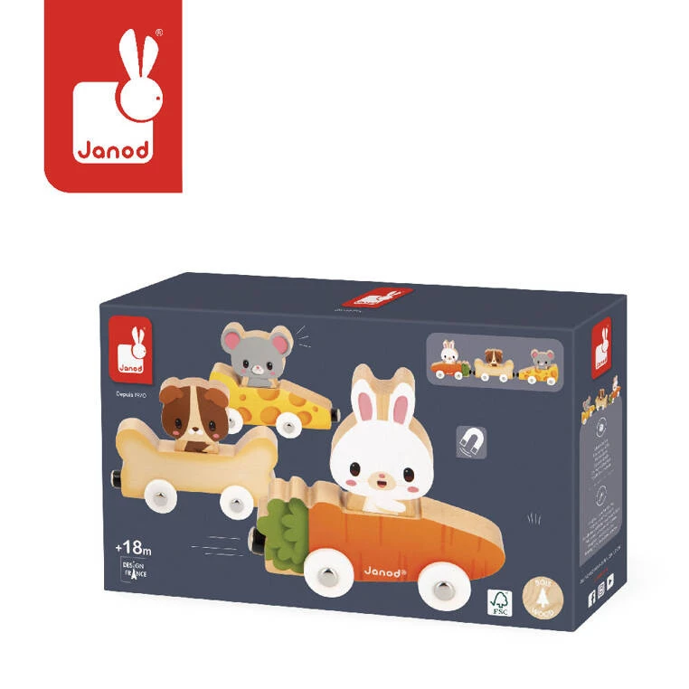 Zestaw drewnianych magnetycznych pojazdów ze zwierzątkami domowymi z kolekcji Farma francuskiej marki JANOD składa się z 3 autek o nietypowych kształtach: w marchewce podróżuje królik, w kosteczce – piesek, a w kawałku sera – myszka. Pojazdami można się bawić osobno lub łączyć je ze sobą dzięki magnesom, a zwierzątka można przesadzać (także trzymają się na magnes). Są poręczne, mają ładne kolory i niebanalny design. Zabawka została zaprojektowana we Francji. Zapakowana jest w estetyczne kartonowe pudełko. Idealnie nadaje się na prezent.