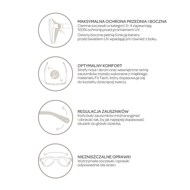 Okulary przeciwsłoneczne francuskiej marki BEABA przeznaczone są dla dzieci powyżej 2. roku życia Zaprojektowane z naciskiem na praktyczność, bezpieczeństwo i wygodę użytkowania, a przede wszystkim ochronę oczu malucha. Antypoślizgowe, zakrzywione ramiona nie uciskają głowy dziecka, są dobrze dopasowane i pozostają na miejscu, również podczas typowych dziecięcych aktywności. Strefa nosa i skroni wykonana została w technologii Fit z elastycznego, trwałego tworzywa, które dopasowuje się do kształtu twarzy. Szczególny, obły kształt oprawek zabezpiecza oczy malucha przed promieniami słonecznymi wpadającymi również z boku. Specjalne, nietłukące się „szkiełka” to ciemne soczewki kategorii 3, tj. gwarantujące maksymalną, 100% ochronę przed promieniami UV. Nadają się do ekspozycji na słońce również na plaży czy w górach. Okulary posiadają regulowane zauszniki 360° oraz elastyczną opaskę, którą można w razie potrzeby zamocować na klik (dzięki silikonowym zaczepom) dla optymalnego komfortu.