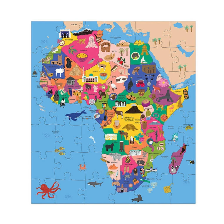 Puzzle konturowe w kształcie Afryki amerykańskiej marki MUDPUPPY nadają układaniu puzzli nowy wymiar – na samym złożeniu obrazka zabawa się bowiem nie kończy. Układanka o wymiarach 46 x 51 cm składa się z 70 elementów, które po złożeniu przedstawiają kolorową mapę Afryki, pełną charakterystycznych zwierząt, dań i budynków. Co więcej, układanka ma kształt tego kontynentu. Układanie tych wyjątkowych puzzli to doskonała rozrywka dla całej rodziny. Są one wykonane z materiału w 90% pochodzącego z recyclingu, a nadruk to nietoksyczny tusz na bazie soi. Zapakowane są w estetyczne kartonowe pudełko. Idealnie nadają się na prezent.