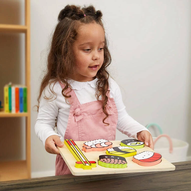 Drewniane puzzle 3D Sushi amerykańskiej marki MUDPUPPY to 6-elementowa układanka dla dzieci już od 1. roku życia. Drewniane części są spore i łatwe do złapania, dzięki czemu dzieci mogą łatwo i szybko oswoić się z tą formą zabawy. Obrazek do ułożenia w wyciętych kształtach na podstawce przedstawia 5 rodzajów sushi oraz pałeczki do ich jedzenia. Piękne kolory i materiały dodatkowo zachęcają do zabawy.