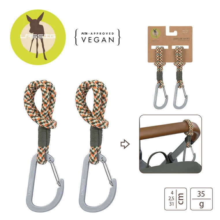 2 piękne i solidne uchwyty ze sznurka do mocowania torby lub innych dodatków na ramie wózka niemieckiej marki LASSIG. Zestaw pasuje do wszystkich standardowych wózków dziecięcych, a ponadto praktyczne haczyki można mocować również np. do ramy roweru czy stosować jako wielofunkcyjne breloczki do plecaków, walizek lub toreb podróżnych. Pętelki wykonane są z elastycznego sznurka z kolorowej przędzy, pochodzącej z recyklingu. Srebrne matowe metalowe karabińczyki są wytrzymałe – uniosą spory ciężar oraz łatwe w obsłudze – dzięki dużemu otwarciu można przy nich umieścić nawet nieporęczne czy nieforemne przedmioty.