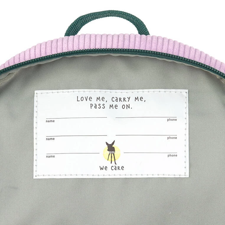 Piękny i praktyczny plecaczek z tęczą z kolekcji Little Gang niemieckiej marki LASSIG. Wykonany jest z niezwykle miękkiego, przyjemnego w dotyku sztruksu cord. Funkcjonalny, lekki i wygodny, idealny do przedszkola i na krótkie wycieczki. Komora główna zapinana jest na suwak, posiada wewnętrzną kieszeń na butelkę z napojem oraz etykietkę z wizytówką, na której można zapisać imię dziecka i numer kontaktowy rodzica. W górnej części znajduje się uszko do zawieszenia plecaka, np. na haczyku w szatni. Dość szerokie, grubsze i miękkie ramiączka zapewniają wygodę noszenia. Na klatce piersiowej dodatkowo wyposażone są z w stabilizujące i odciążające plecy zapięcie na zatrzask – jego wysokość, podobnie jak długość ramiączek, można regulować i na bieżąco dopasowywać do wzrostu dziecka. Plecak ma jasny liliowy kolor i czerwoną, teksturowaną aplikację na przodzie – trzypasmową tęczę. Uszko, paski oraz suwak mają kolor zgaszonej zieleni. Materiał plecaka łatwo się czyści i jest odporny na wilgoć. Produkt jest częścią większej kolekcji. Możesz dobrać do niego inny w podobnym kolorze lub z podobnym motywem.