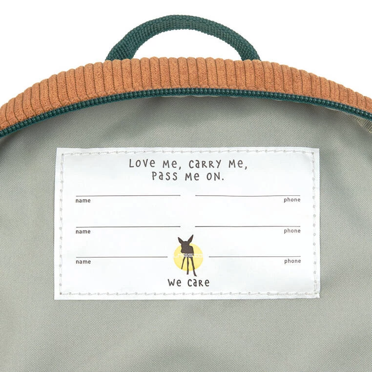 Piękny i praktyczny plecaczek SMILE z kolekcji Little Gang niemieckiej marki LASSIG. Wykonany jest z niezwykle miękkiego, przyjemnego w dotyku sztruksu cord. Funkcjonalny, lekki i wygodny, idealny do przedszkola i na krótkie wycieczki. Komora główna zapinana jest na suwak, posiada wewnętrzną kieszeń na butelkę z napojem oraz etykietkę z wizytówką, na której można zapisać imię dziecka i numer kontaktowy rodzica. W górnej części znajduje się uszko do zawieszenia plecaka, np. na haczyku w szatni. Dość szerokie, grubsze i miękkie ramiączka zapewniają wygodę noszenia. Na klatce piersiowej dodatkowo wyposażone są z w stabilizujące i odciążające plecy zapięcie na zatrzask – jego wysokość, podobnie jak długość ramiączek, można regulować i na bieżąco dopasowywać do wzrostu dziecka. Plecak ma karmelowy kolor i teksturowaną aplikację na przodzie – kolorowy napis SMILE. Uszko, paski oraz suwak mają kolor zgaszonej zieleni. Materiał plecaka łatwo się czyści i jest odporny na wilgoć. Produkt jest częścią większej kolekcji. Możesz dobrać do niego inny w podobnym kolorze lub z podobnym motywem.