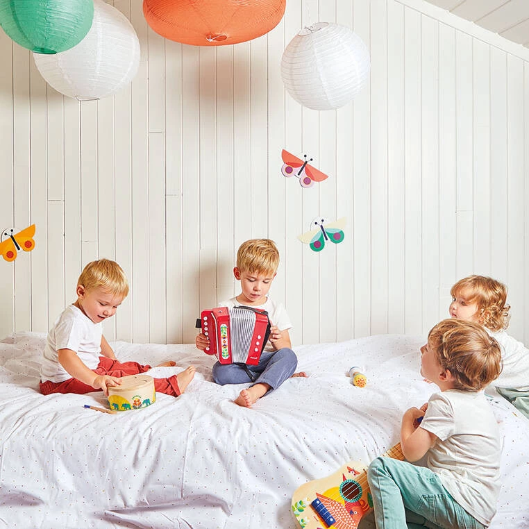 Akordeon z serii Gioia francuskiej marki JANOD to idealna pierwsza zabawka muzyczna dla dziecka, która pomaga rozwijać słuch, poczucie rytmu oraz zdolności muzyczne. Wspiera także rozwój wyobraźni, koncentracji, wytrwałości i koordynacji ruchowej. Akordeon jest wykonany z solidnego tworzywa, posiada trwały miech, poręczny dla dziecięcych rączek rozmiar oraz wydaje przyjemny dźwięk. Jest czerwony z białymi elementami i kolorową grafiką tropikalnych roślin. Zabawka została zaprojektowana we Francji. Zapakowana jest w estetyczne, kartonowe pudełko. Idealnie nadaje się na prezent.