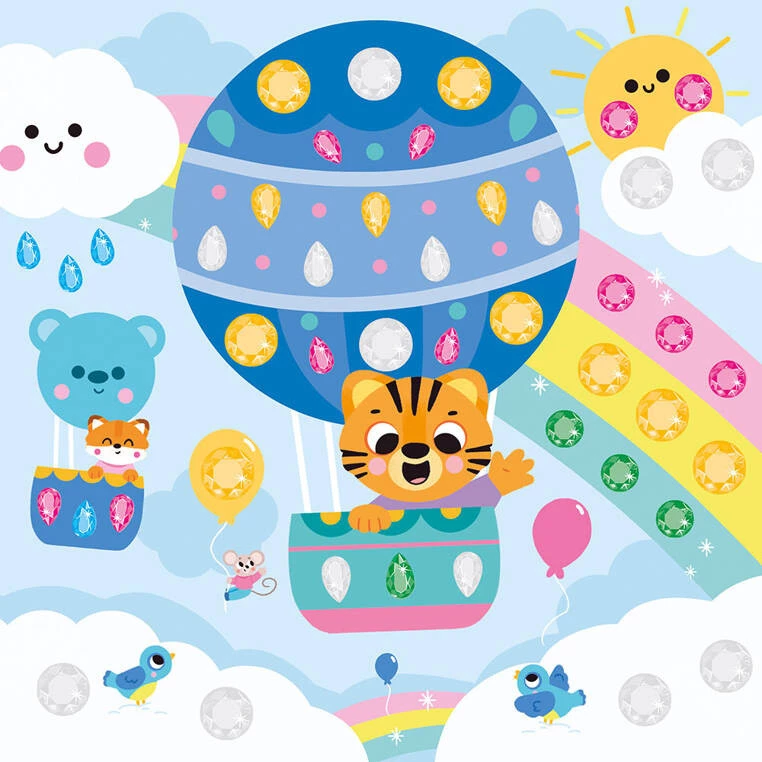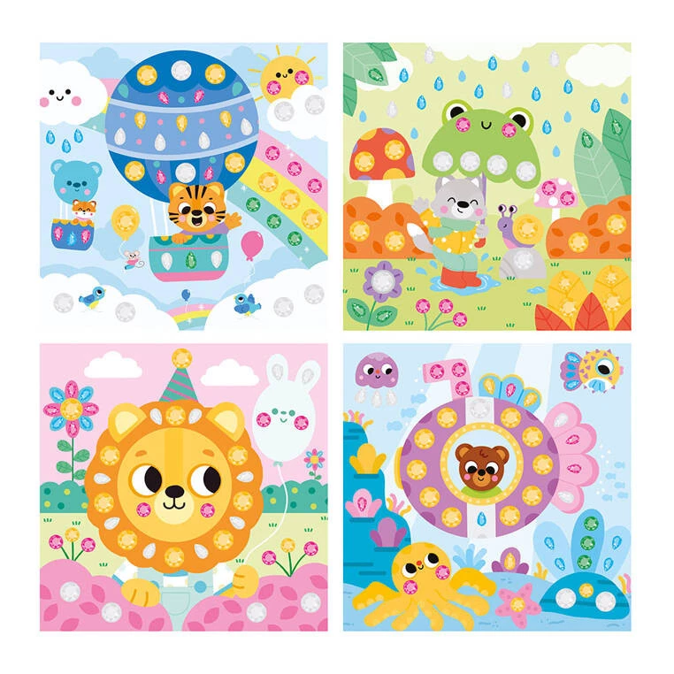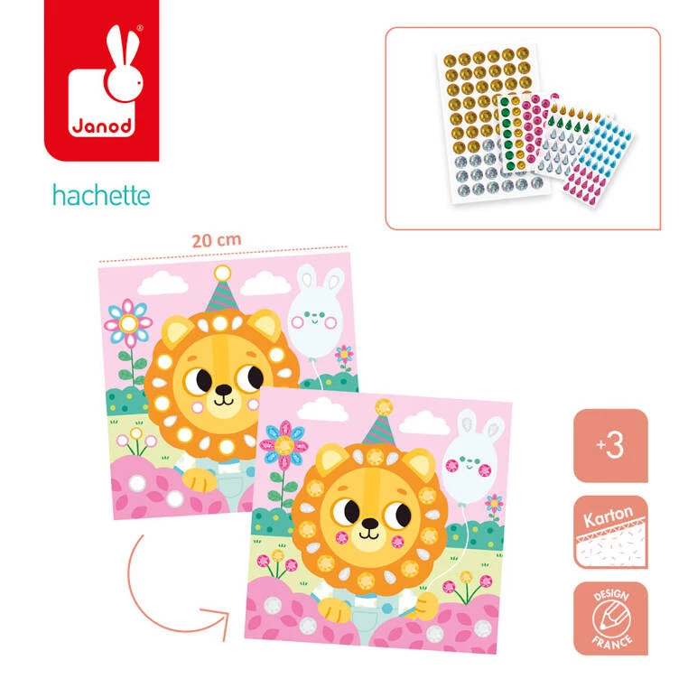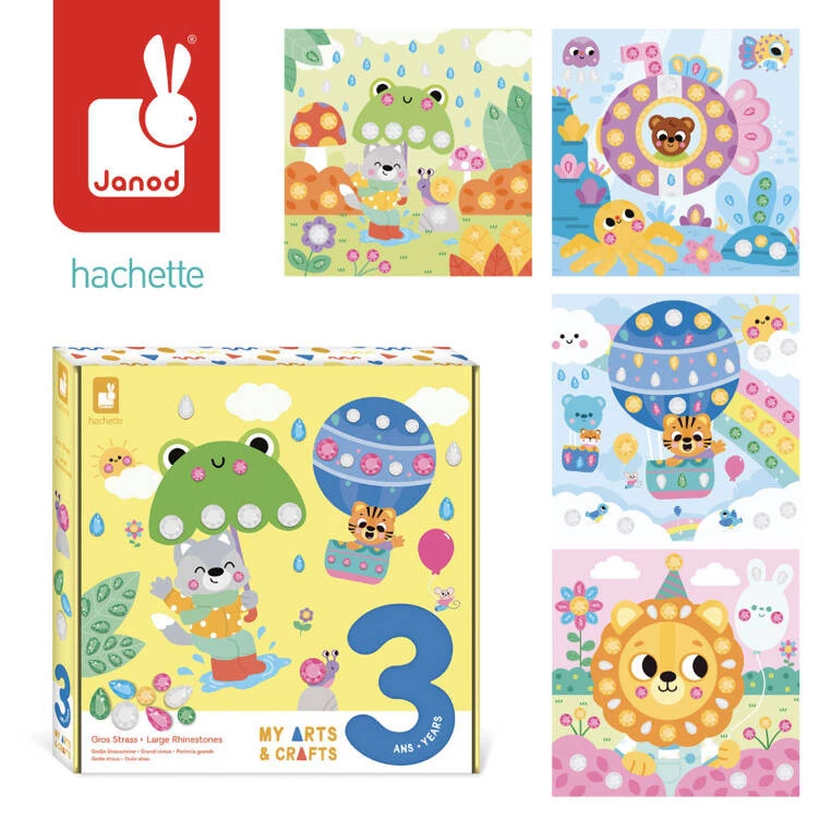 Zestaw kreatywny Duże Cyrkonie My arts & crafts francuskiej marki JANOD zawiera 4 kwadratowe plansze z obrazkami, które przedstawiają: spacer w deszczu, lot balonem, podróż w łodzi podwodnej oraz lwa podczas przyjęcia urodzinowego w dżungli. Do ilustracji tych można – zarówno w sugerowanych miejscach, jak i dowolnie – przyklejać dołączone do zestawu kolorowe kryształki w różnych kształtach. Naklejanie i zdobienie to dla dziecka długie godziny angażującej i jednocześnie uspokajającej, wyciszającej zabawy.