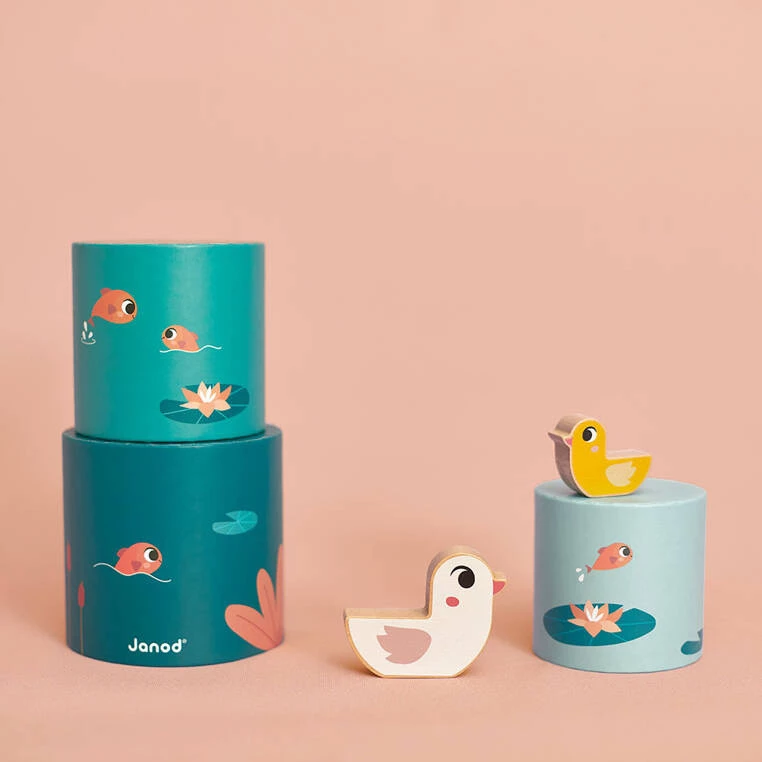 • okrągła kartonowa 3-elementowa piramida, przedstawiająca staw oraz 2 drewniane kaczki – wspiera rozwój chwytu i małej motoryki;