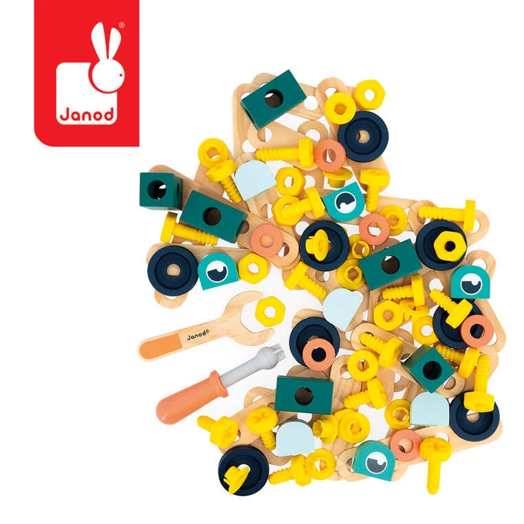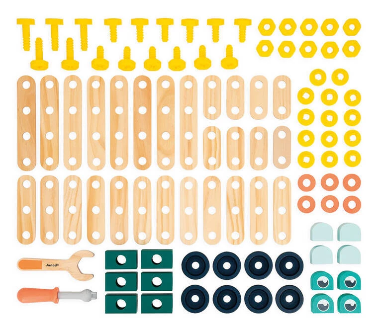 100-elementowy zestaw konstruktora z kolekcji Brico'kids francuskiej marki JANOD to idealny prezent dla małego majsterkowicza. Dzięki różnorodnym drewnianym elementom zabawka wspomaga rozwój dziecka na wielu płaszczyznach: rozwija zdolności manualne, cierpliwość, koncentrację, a także stymuluje wyobraźnię i umiejętności społeczne, zachęcając do odgrywania scen, imitujących zachowanie dorosłych. W skład zestawu wchodzą: elementy drewniane, elementy plastikowe (podkładki, nakrętki, śrubki) oraz śrubokręt i klucz. Dołączono do niego również 10 kart z propozycjami konstrukcji do zbudowania. Dzięki sporej ilości akcesoriów zabawką może bawić się jednocześnie więcej niż jedno dziecko. Zestaw zaprojektowany został we Francji. Zapakowany jest w estetyczne pudełko. Idealnie nadaje się na prezent.