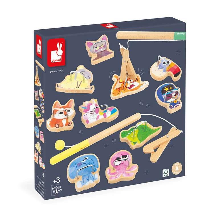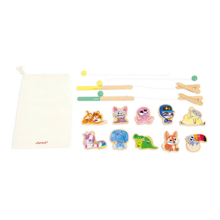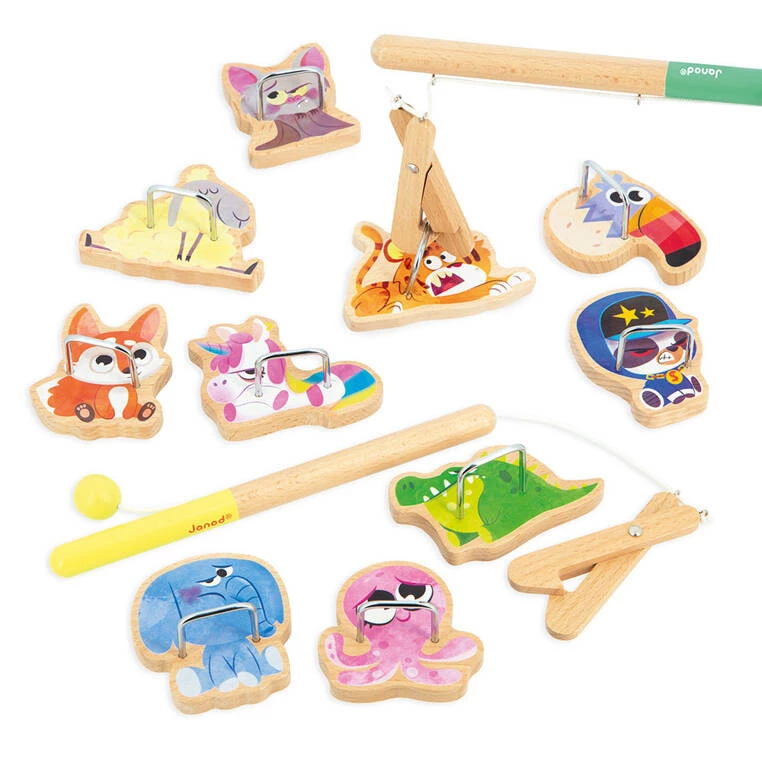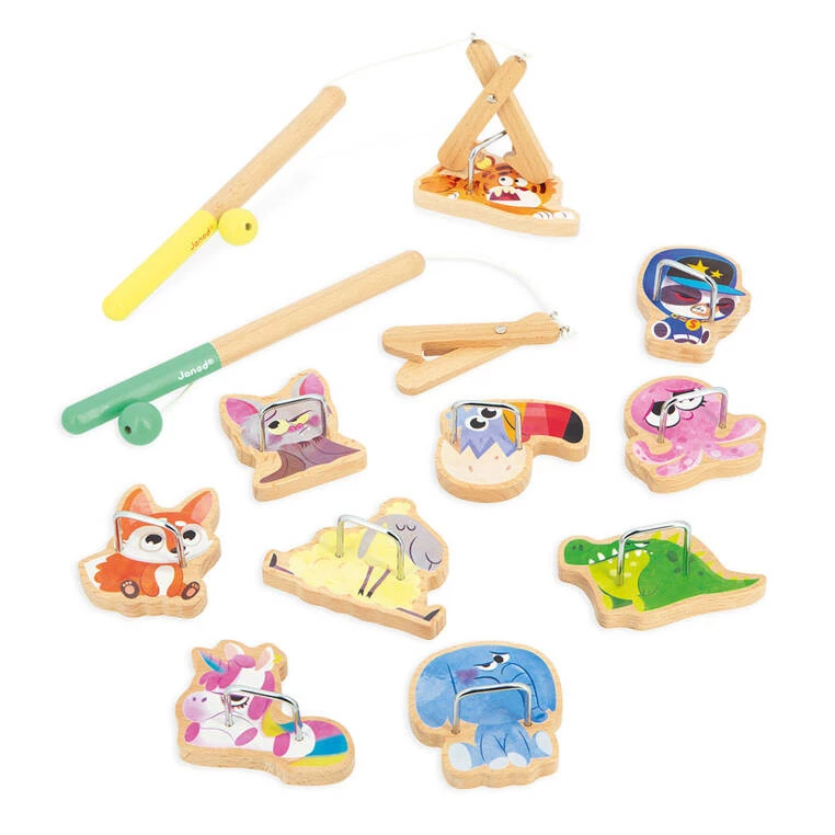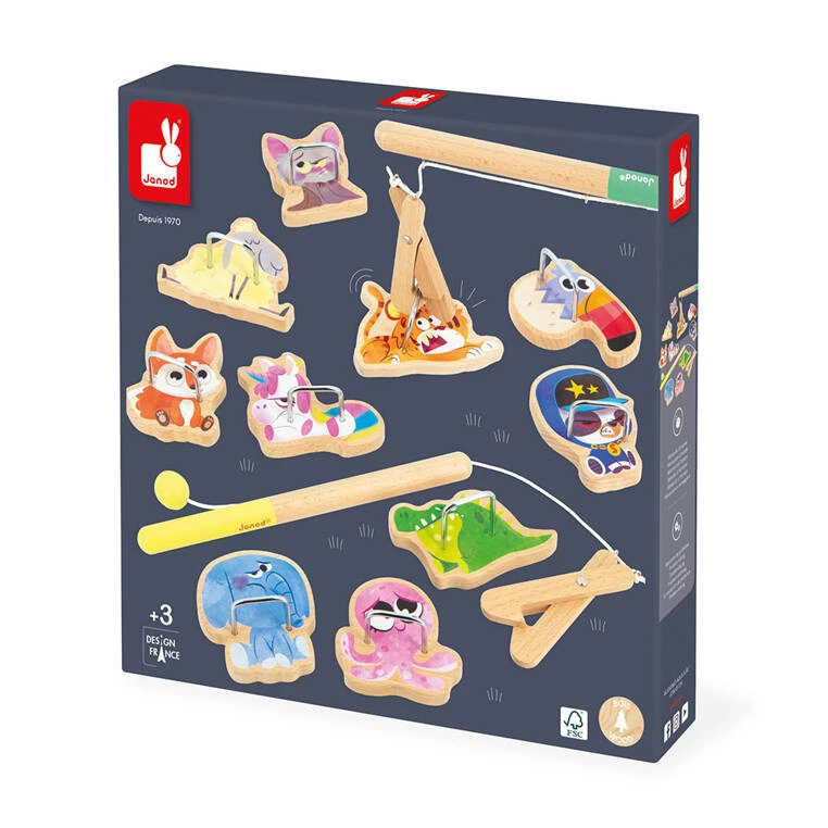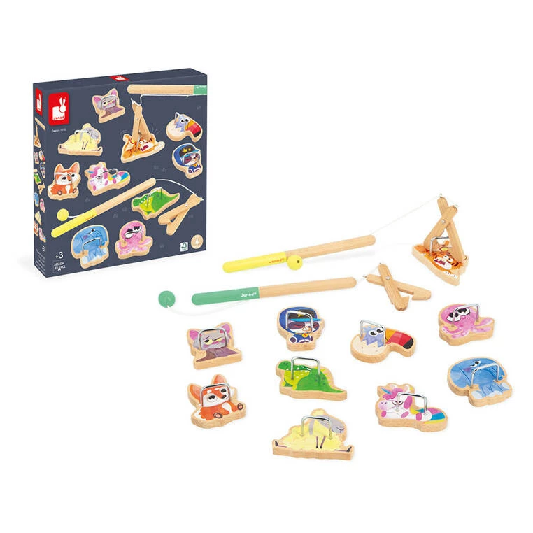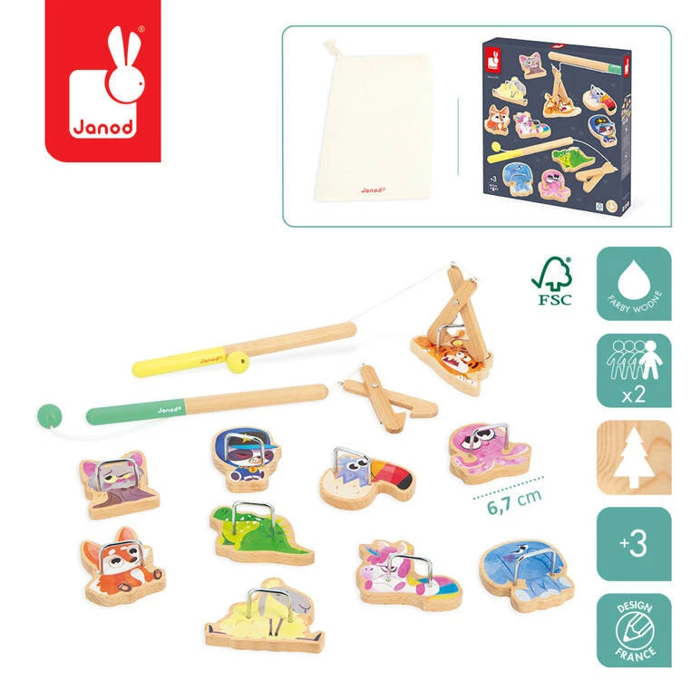 Gra zręcznościowa Łowienie rybek z kolekcji Applepop francuskiej marki JANOD to wspaniała zabawa dla dwójki dzieci lub dziecka i rodzica. W skład zestawu wchodzą dwie drewniane wędki z klipsami na końcach oraz 10 szalonych zwierząt do wyłapania. Drewniane figurki mają spore metalowe uchwyty, dzięki którym dają się złapać na klips. Celem gry jest złowienie jak największej ilości stworzeń. Gracz, który zgromadzi ich więcej – wygrywa. Gra ćwiczy koordynację ruchową, wspiera relację ręka-oko, uczy cierpliwości i skupienia.
