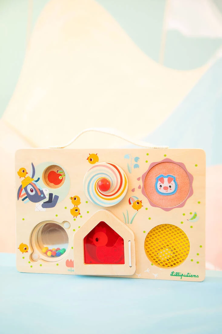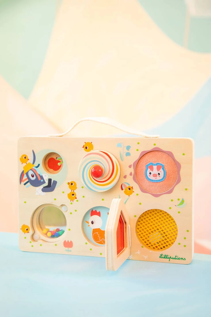 Drewniana tablica manipulacyjna w kształcie walizki z kolekcji Farma belgijskiej marki Lilliputiens to niebanalne wielofunkcyjne źródło rozrywki i nauki dla ciekawskich maluszków. Zabawka posiada sześć okrągłych okienek i funkcji: obracany element ze zmieniającymi się obrazkami, koło iluzji optycznych, okienko piszczące przy naciskaniu, okienko z lusterkiem i grzechotką w jednym, miejsce z otwieranymi drzwiczkami kurnika, okienko z gumową siatką i ukrytym pod nią elementem. Drewniana tablica ma kształt walizki z zaoblonymi brzegami i szerokim uchwytem z tkaniny,    piękne, naturalne kolory i motywy z kolekcji Farma. Zabawka jest solidnie wykonana i w pełni bezpieczna. Zaskakuje i pobudza dziecięcą wyobraźnię. Rozwija koordynację ręka-oko oraz małą motorykę (chwytanie, potrząsanie, wkładanie, wyjmowanie, otwieranie, zamykanie, przesuwanie, obracanie, naciskanie), aktywizuje zmysł słuchu (grzechotanie), wzroku (lusterko, iluzje) i dotyku.