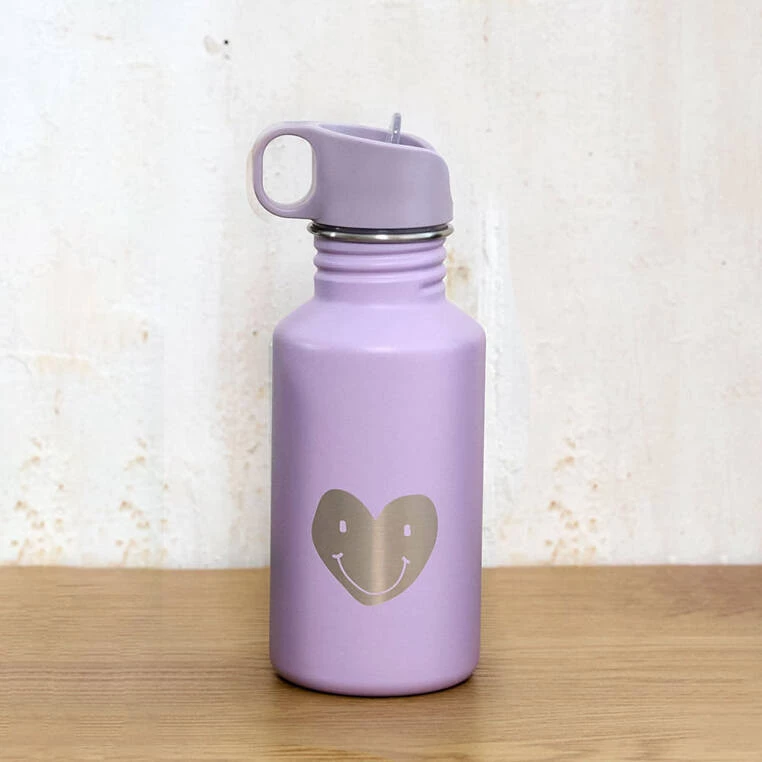 Solidny bidon ze stali nierdzewnej niemieckiej marki LASSIG przyda się nie tylko do szkoły, ale również podczas rodzinnych spacerów i wycieczek. Ma pojemność 500 ml, jest lekki, szczelny i bardzo wytrzymały. Doskonały zarówno do ciepłych, jak i do chłodnych, niegazowanych napojów. To idealne rozwiązanie na wszelkie wyjazdy oraz aktywności na dworze. Odkręcana pokrywka posiada silikonową uszczelkę, wygodny ustnik i rączkę z tworzywa. Bidon jest łatwy w obsłudze i ma ergonomiczny kształt – z łatwością zmieści się do plecaka, torebki lub bocznej kieszonki. Ma jasny liliowy kolor ze srebrną grafiką uśmiechniętego serduszka i nieco ciemniejszą fioletową pokrywką.