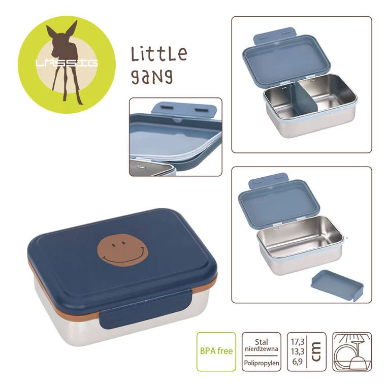 Solidne pudełko śniadaniowe ze stali nierdzewnej niemieckiej marki LASSIG przyda się nie tylko do szkoły, ale również podczas rodzinnych spacerów i wycieczek. Jest pojemne i posiada ruchomą, wyjmowaną przegrodę, dzięki której można je podzielić na dwie części, np. większą na kanapki, a mniejszą na owoce, krojone warzywa czy inne przekąski. Pudełko jest szczelne (ma silikonową uszczelkę) i solidne. Szeroki klips, na który jest zamykane, uniemożliwia samoczynne otwarcie. Lunchbox ma ergonomiczny kształt. Zmieści się nawet do małego plecaka. Box ma srebrny kolor, pokrywka jest w kolorze ciemnogranatowym z karmelową grafiką uśmiechniętej buźki, a uszczelka – również karmelowa.