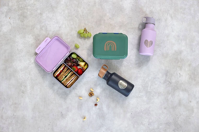 Solidne pudełko śniadaniowe ze stali nierdzewnej niemieckiej marki LASSIG przyda się nie tylko do szkoły, ale również podczas rodzinnych spacerów i wycieczek. Jest pojemne i posiada ruchomą, wyjmowaną przegrodę, dzięki której można je podzielić na dwie części, np. większą na kanapki, a mniejszą na owoce, krojone warzywa czy inne przekąski. Pudełko jest szczelne (ma silikonową uszczelkę) i solidne. Szeroki klips, na który jest zamykane, uniemożliwia samoczynne otwarcie. Lunchbox ma ergonomiczny kształt. Zmieści się nawet do małego plecaka. Box ma srebrny kolor, pokrywka jest w głębokim kolorze zielonym z karmelową grafiką trzypasmowej tęczy, uszczelka zaś jest chabrowa.