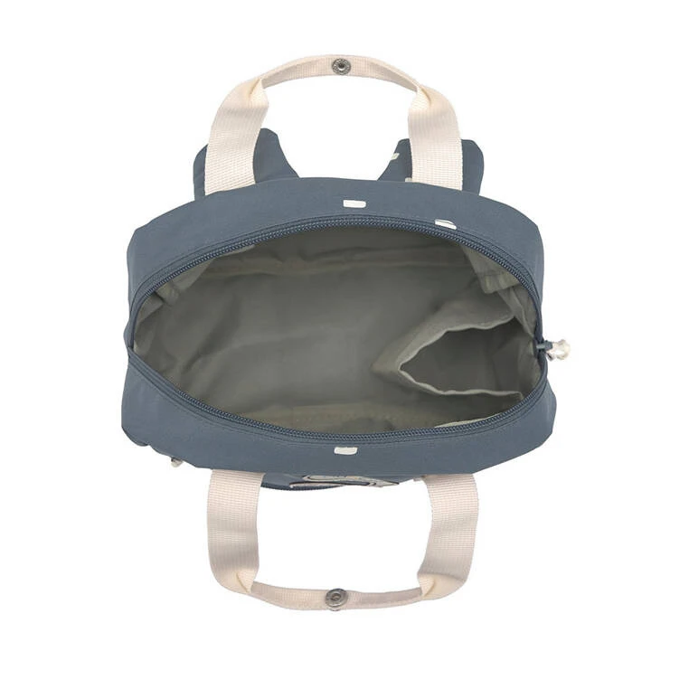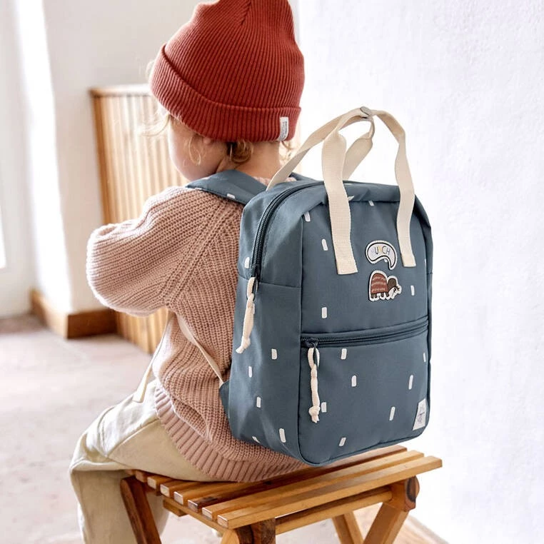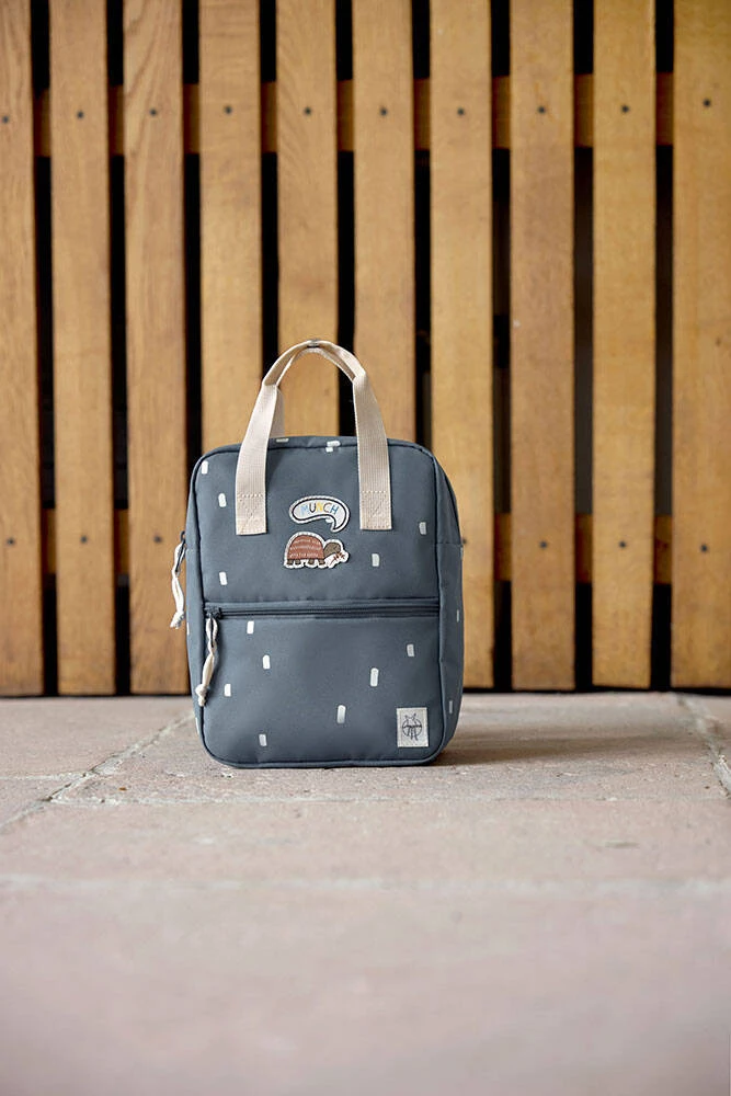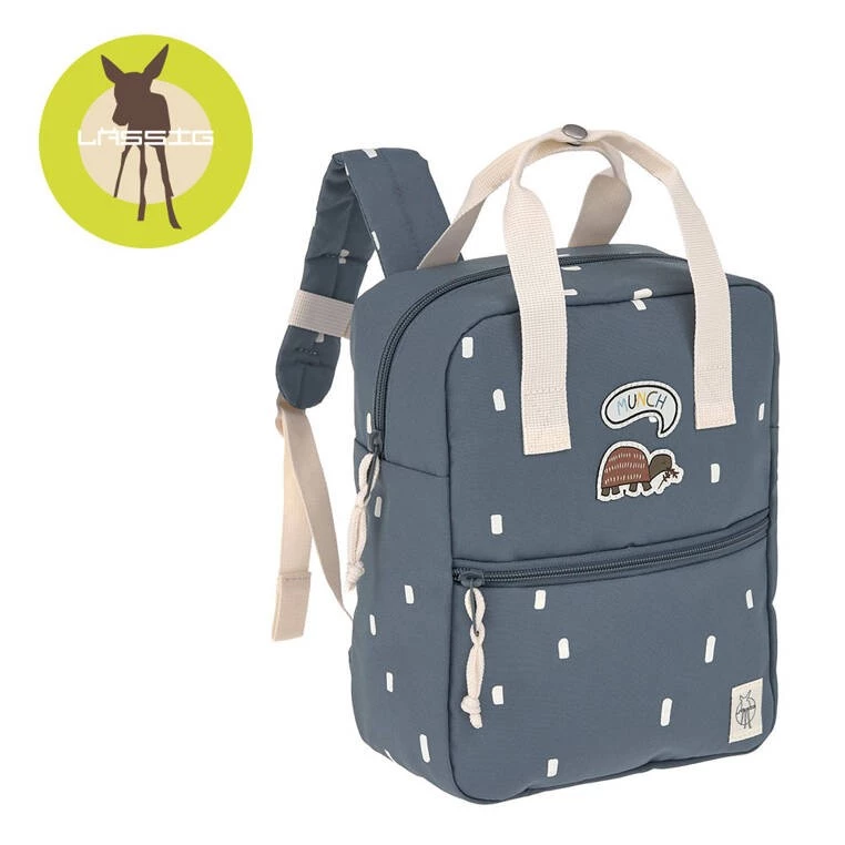 Funkcjonalny, uroczy kwadratowy plecak niemieckiej marki LASSIG. Sprawdzi się zarówno do przedszkola, jak i podczas wycieczek. Jest lekki, wygodny, o optymalnej pojemności 7l. Zwraca uwagę niebanalną kolorystyką – materiał plecaczka ma granatowy kolor w urocze białe ciapki, detale zaś, m.in. rączki, pasy z regulacją i ozdobne sznureczki przy suwakach – są jasnokremowe. Z przodu naszyte są ponadto urocze aplikacje: brązowy żółw i jasna „chmurka” z napisem MUNCH. Plecak posiada pojemną komorę główną. Wewnątrz znajduje się okrągła kieszonka na butelkę oraz wizytówka, na której można zapisać imię dziecka i numer kontaktowy rodzica. Z przodu plecaczka znajduje się mniejsza kieszeń na suwak. Plecak uszyto z wysokiej jakości, trwałych materiałów, tylna ścianka jest lekko wzmocniona, ale pozostaje miękka w kontakcie z plecami dziecka. W górnej części znajdują solidne rączki, które można spiąć ze sobą napem. Ramiączka – dość szerokie, grubsze i miękkie – zapewniają wygodę noszenia, dodatkowo wyposażone są w stabilizujące i odciążające plecy pasy, zapinane na zatrzask z przodu, na klatce piersiowej – jego wysokość, podobnie jak długość ramiączek, można regulować i na bieżąco dopasowywać do wzrostu dziecka. Materiał plecaka łatwo się czyści i jest odporny na wilgoć.