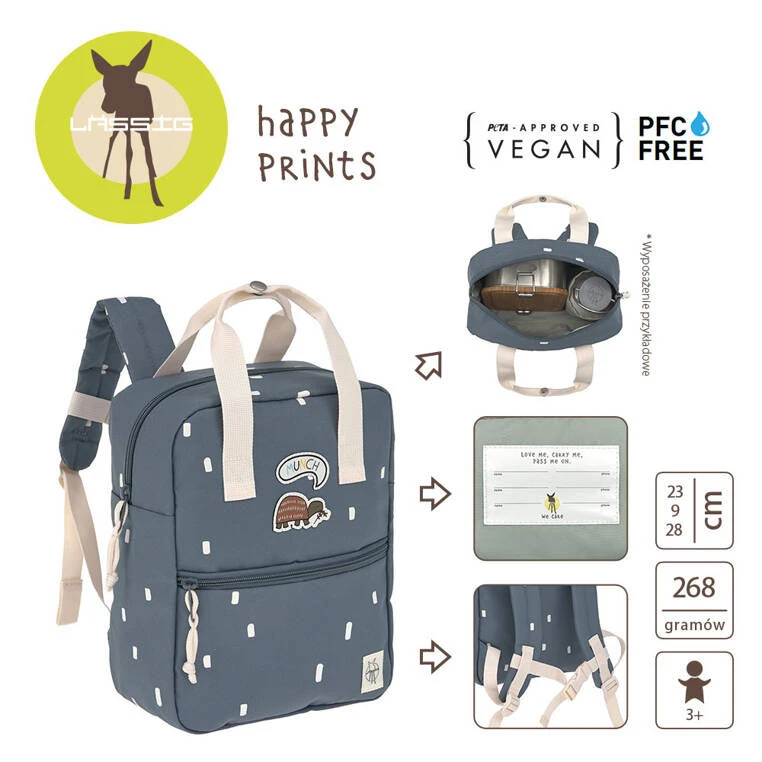 Wszystkie torby i plecaki LASSIG wyprodukowane są z poszanowaniem środowiska, z materiałów wolnych od PCV, ftalanów, niklu czy kadmu. Plecak mini stanowi część większej kolekcji Happy Prints. Możesz dobrać do niego inny produkt w tej samej gamie kolorystycznej i z tym samym motywem.