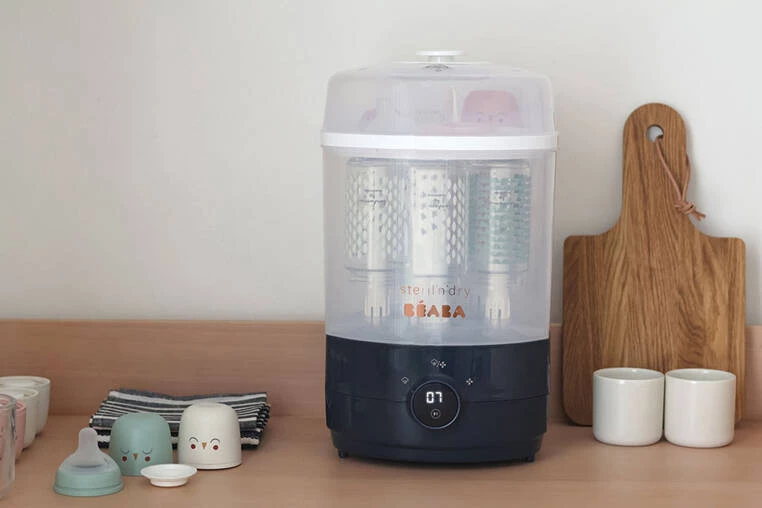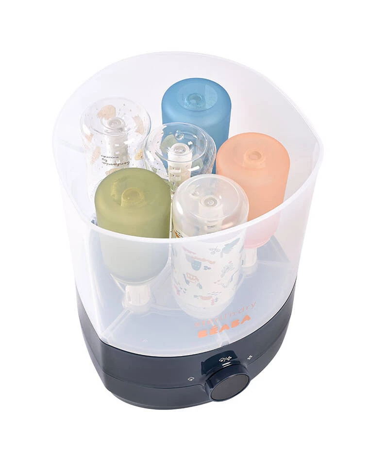 Ultra szybki sterylizator parowy i suszarka 2w1 Steril 'n' dry francuskiej marki BEABA. Skutecznie eliminuje główne bakterie z butelek dla niemowląt i akcesoriów, pozostawiając je suche i gotowe do użycia. Jego wnętrze podzielone jest na dużą i małą przestrzeń, których można używać jednocześnie lub osobno, w zależności od aktualnej potrzebny. Na pełnej powierzchni (metoda maxi) pomieści do 6 butelek wraz z dodatkami. Mniejszy pojemnik (metoda mini) będzie z kolei idealny do sterylizacji tylko drobnych akcesoriów, np. smoczków. Urządzenie oferuje 3 tryby do wyboru (sterylizacja + suszenie: 38 min / sterylizacja: 8 min / suszenie 30 min) oraz jest łatwe w obsłudze - posiada obrotowy przycisk i timer z wyświetlaczem LED odliczający czas do zakończenia pracy. Po zakończeniu cyklu samo się wyłącza.