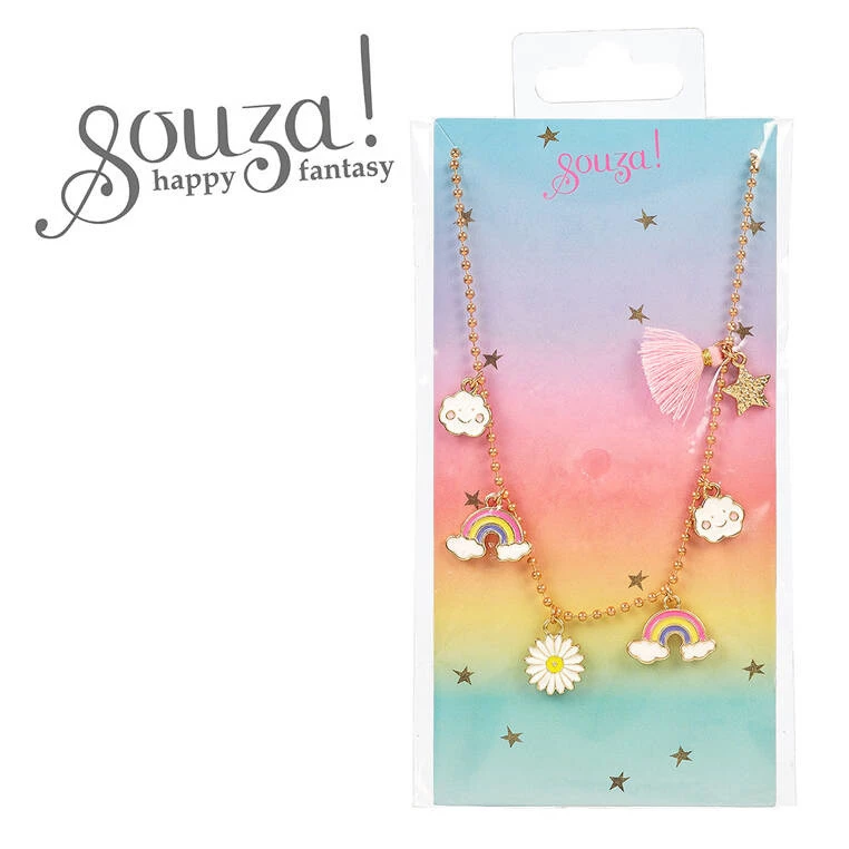 Złoty naszyjnik z zawieszkami Niebo holenderskiej marki Souza! To ozdobny łańcuszek z małych kuleczek z 6 ozdobnymi zawieszkami w kształcie: tęczy, uśmiechniętych chmurek i kwiatka oraz z ozdobnym różowym chwostem z małą gwiazdką. Naszyjnik ma długość 36 cm.