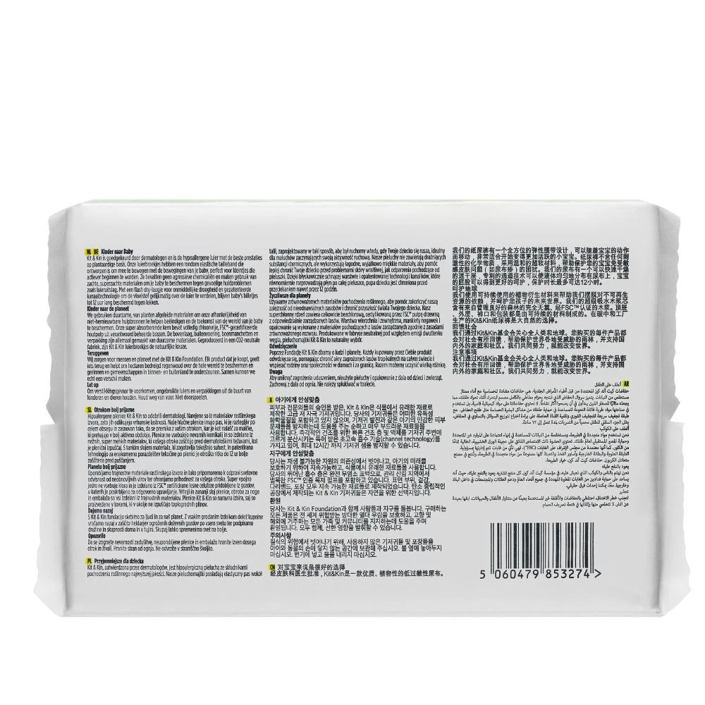 Kit&Kin używa zrównoważonych materiałów, aby położyć kres zależności od nieodnawialnych zasobów i chronić przyszłe zasoby świata dla Twojego dziecka. Miękkie podszewki wewnętrzne i zewnętrzne są wykonane z naturalnych materiałów pochodzenia roślinnego. Puszysta warstwa chłonna bez chloru z pulpy roślinnej pochodzącej z lasów gospodarowanych według zasad FSC. Warstwa zewnętrzna i zabezpieczenia przed wyciekami są wykonane z materiału biodegradowalnego, który może ulec biodegradacji w ciągu 3–6 lat.Wydajność: