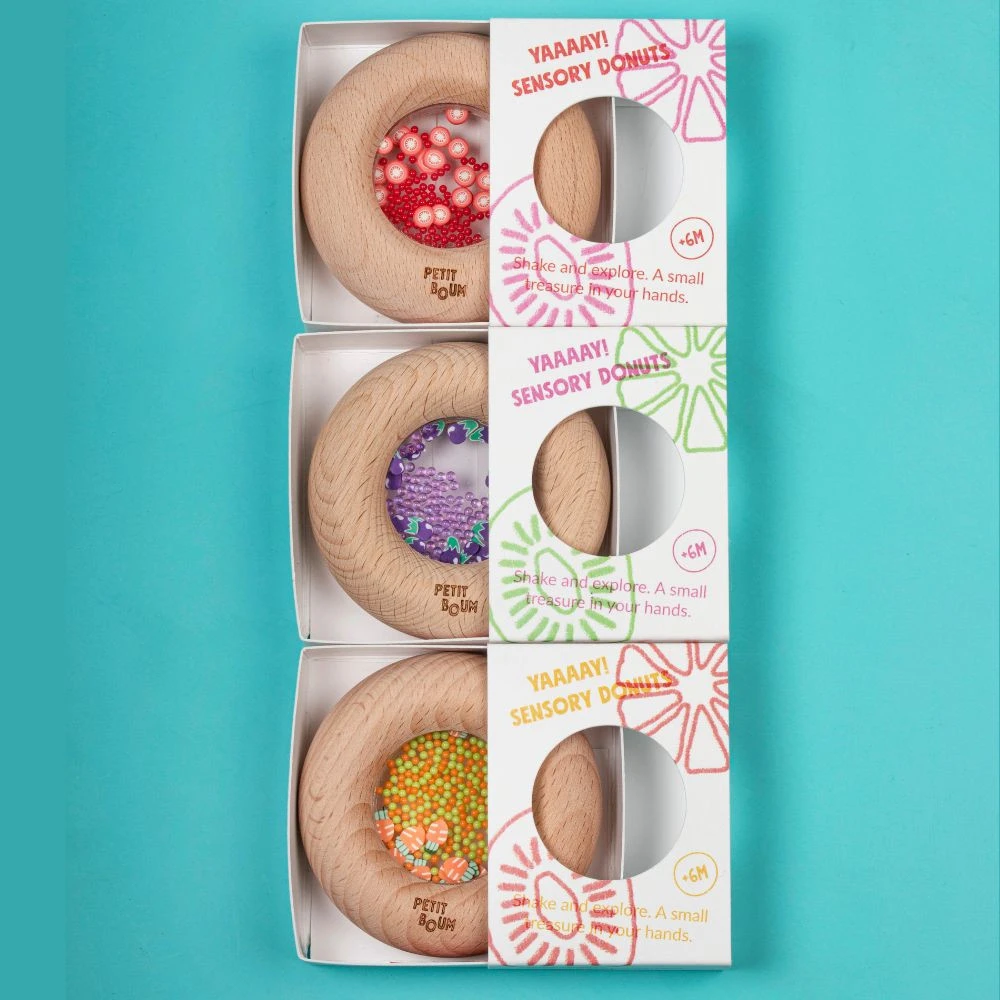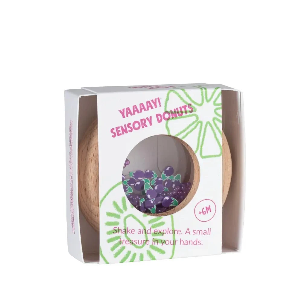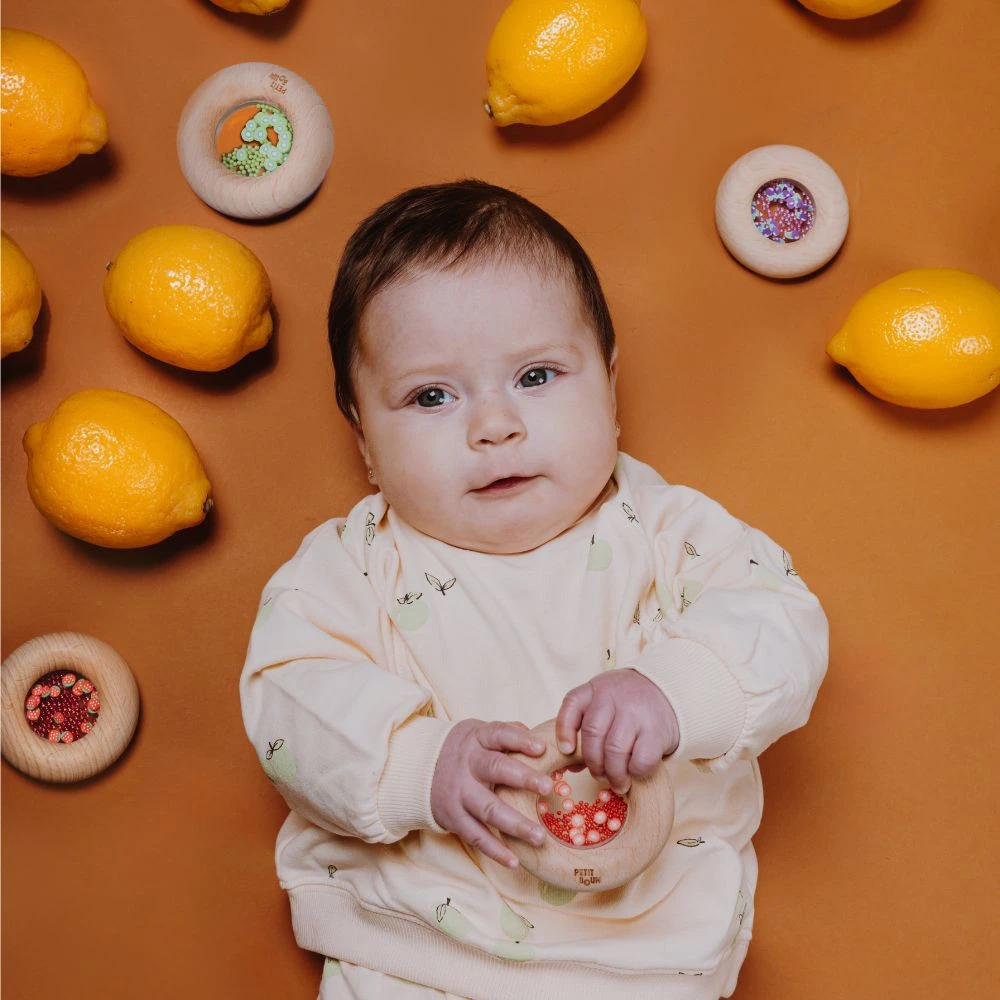 Grzechotka sensoryczna z tej kolekcji to idealny wybór dla maluchów od 6. miesiąca życia. Wykonana z wysokiej jakości drewna bukowego, ma okrągły kształt przypominający donuta z grzechoczącym nadzieniem w środku. Kuleczki oraz kolorowe elementy w kształcie owoców i warzyw przemieszczają się, tworząc delikatne dźwięki, które stymulują zmysły dziecka. Naturalne drewno jest bezpieczne oraz łatwe do chwycenia.
