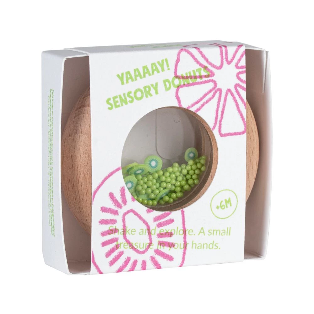 Grzechotka sensoryczna z tej kolekcji to idealny wybór dla maluchów od 6. miesiąca życia. Wykonana z wysokiej jakości drewna bukowego, ma okrągły kształt przypominający donuta z grzechoczącym nadzieniem w środku. Kuleczki oraz kolorowe elementy w kształcie owoców i warzyw przemieszczają się, tworząc delikatne dźwięki, które stymulują zmysły dziecka. Naturalne drewno jest bezpieczne oraz łatwe do chwycenia.