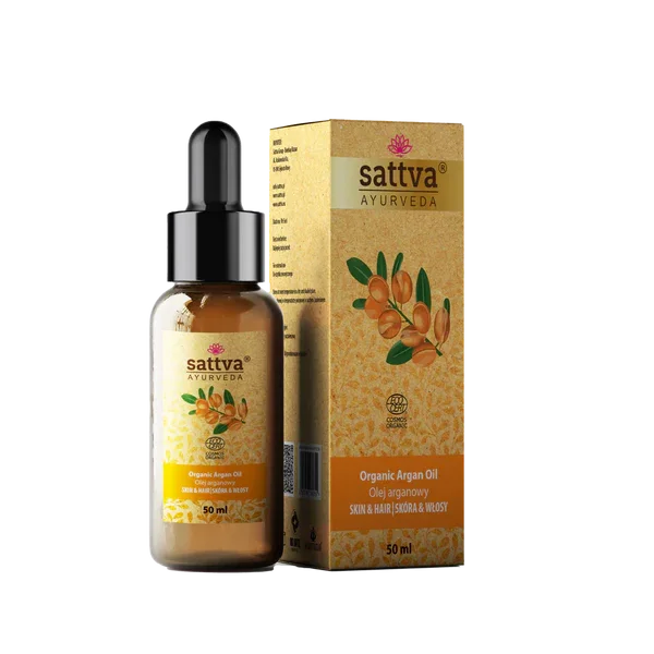 - Organiczny olej arganowy Sattva intensywnie nawilża, wzmacnia włosy i wygładza skórę, pozostawiając ją elastyczną i odżywioną.