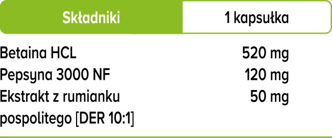 Betaina HCL, pepsyna 3000 NF, ekstrakt z rumianku pospolitego [DER 10:1], otoczka kapsułki: hydroksypropylometyloceluloza.