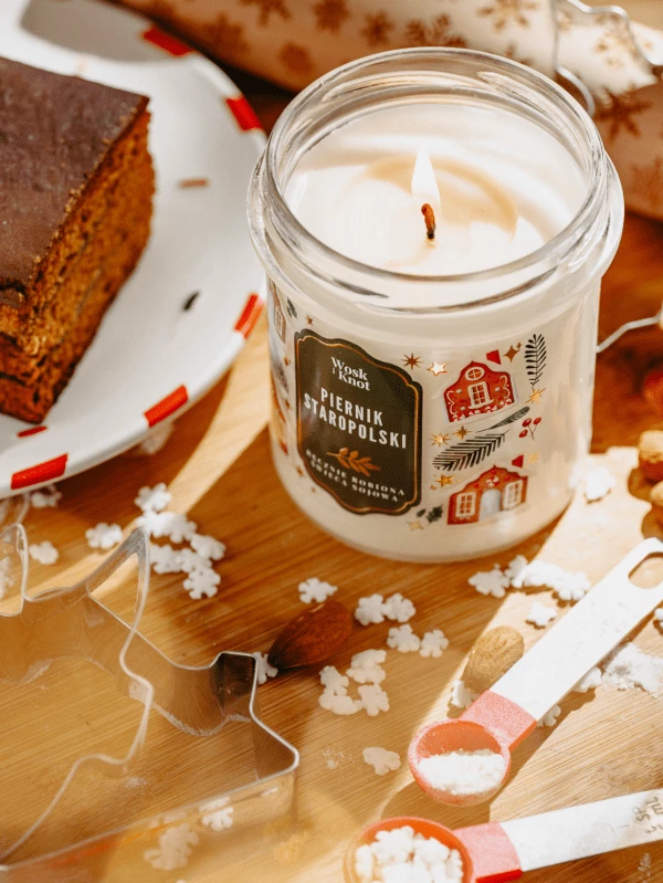 - Piernik Staropolski Świeca Sojowa – esencja świątecznego ciepła, przynosząca do wnętrz zapach, który jest jak podróż w czasie do tradycyjnej polskiej kuchni pełnej świątecznych wypieków.