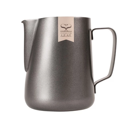 Dzbanek do spieniania mleka od Espresso Gear. Wykonany ze stali nierdzewnej pokrytej teflonem, dzięki czemu powierzchnia jest łatwiejsza w utrzymaniu.