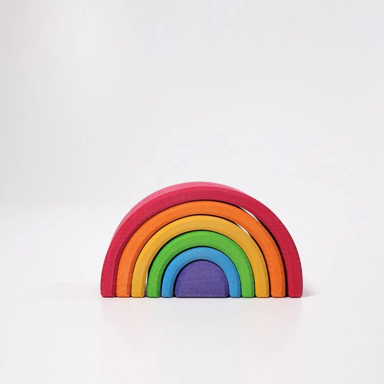 Tęcza ma w sobie coś magicznego. Dzieci uwielbiają przyglądać się jej, gdy pojawia się na niebie po letniej burzy. Chętnie słuchają i uczą się o tym jak powstaje, fantazjując jednocześnie o bajkowej krainie po jej drugiej stronie. Jeżeli dostaną do rąk swą własną tęczę, na pewno się ucieszą. Te kolorowe drewniane łuki Grimm's kryją w sobie znacznie więcej możliwości niż mogłoby wydawać się na pierwszy rzut oka. Dziecko może ustawić z nich tęczę i odkryć w jakiej kolejności układają się kolory. Może stworzyć z nich barwny tunel dla aut. Drewniane łuki przy odrobinie cierpliwości i fantazji można na wiele sposobów ustawiać jedne na drugich. Każdy z nich da się również wykorzystać jako element konstrukcji powstającej z innych klocków. Dzieci chętnie zamieniają je w kołyski dla lalek lub ogrodzenie dla "zwierzaków". Tak naprawdę to co powstanie z Tęczy Grimm's zależy wyłącznie od kreatywności dziecka, bo siła tkwi w prostocie.
