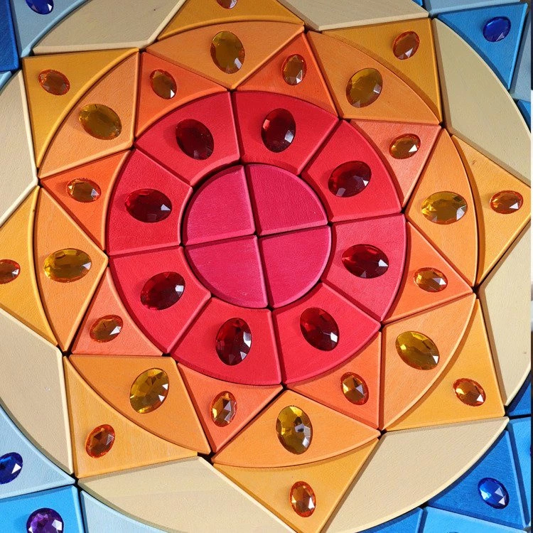 Zestaw drewnianych klocków o fantazyjnych kształtach, zdobionych kolorowymi „kryształami”. Można układać z nich kolorowe błyszczące mandale lub używać ich w połączeniu z innymi klockami i zabawkami Grimm’s.