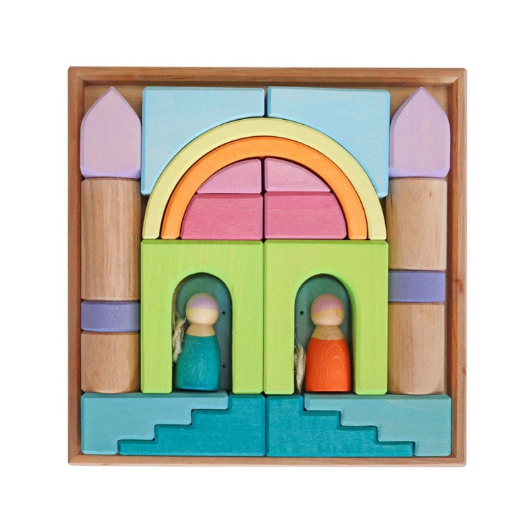 Kolorowe klocki Montessori dla dziecka w stylowej, drewnianej obudowie. Dzięki takiego rozwiązaniu, po skończonej zabawie, poszczególne elementy się nie zgubią. Maluch może układać figury w ramie, ale równie dobrze ustawiać je osobno, według własnego pomysłu. To drewniana scenka z dwoma ludzikami w zestawie. Wystarczy, że dziecko uruchomi wyobraźnię i może wyczarować z tych aksamitnych w dotyku elementów prawdziwe cuda. Po ułożeniu powstaną np. wymyślne budowle, skomplikowane labirynty, czy niesamowite stwory. To tylko namiastka możliwości, które daje zestaw drewnianych klocków od Grimm’s. Zabawę uatrakcyjniają detale zestawu w postaci sznureczków do montażu ruchomych drzwi.
