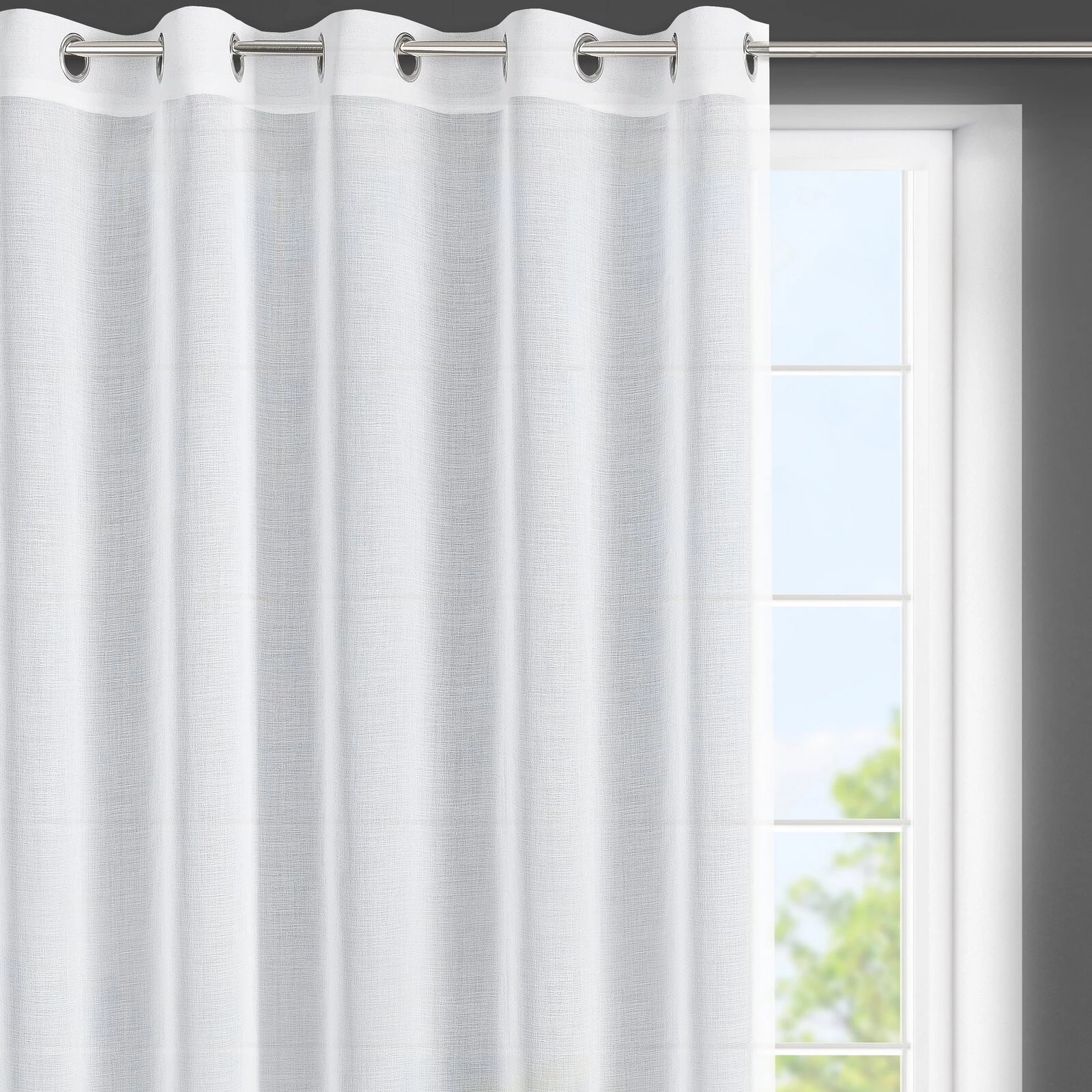 - Firana gotowa gładka, jednokolorowa szerokość: 350 cm, długość: 150 cm, kolor: biały, Gramatura: 70 GSM, Skład: 100% poliester