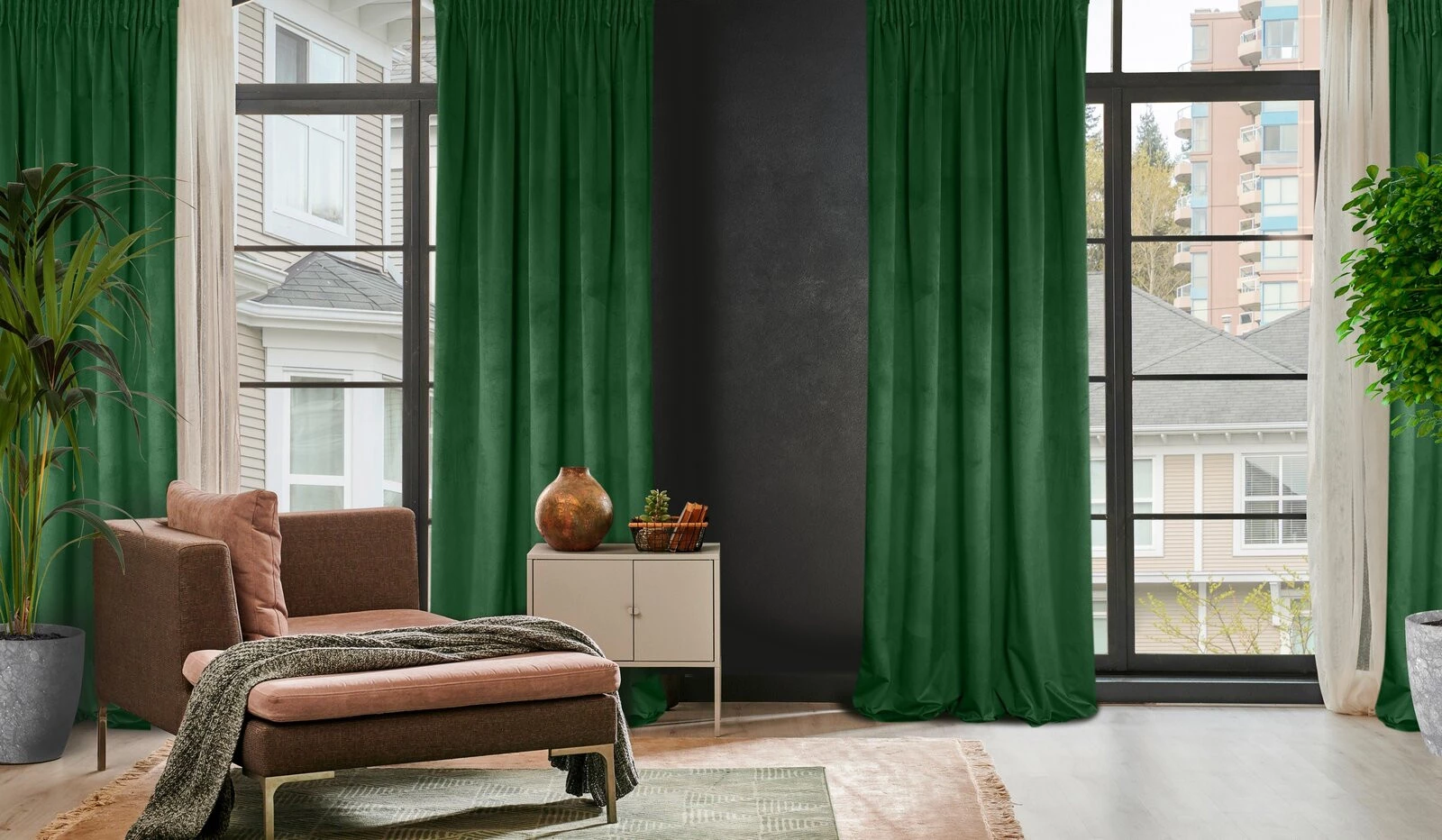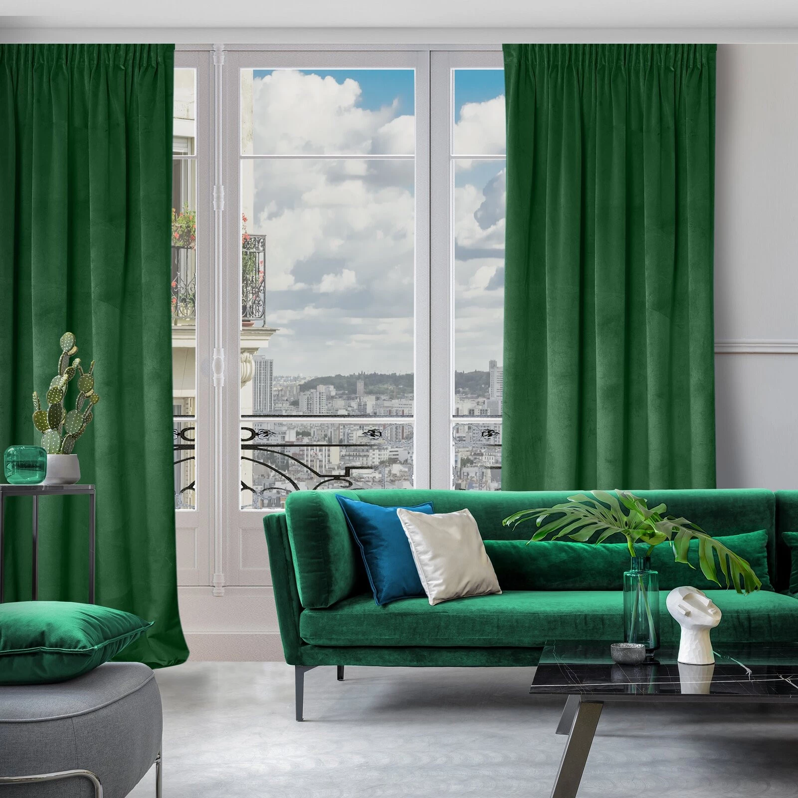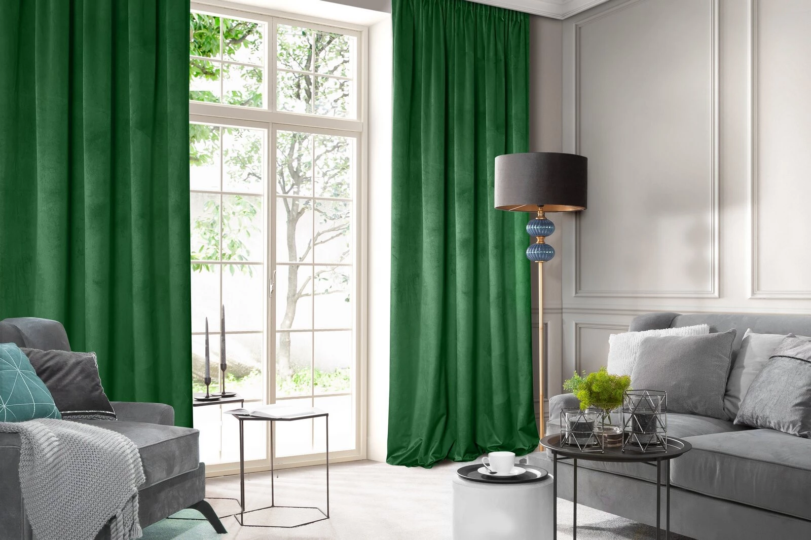 - Zasłona welwetowa jednokolorowa szerokość: 140 cm, długość: 270 cm, kolor: ciemnozielony, Gramatura: 200 GSM, Skład: 100% poliester