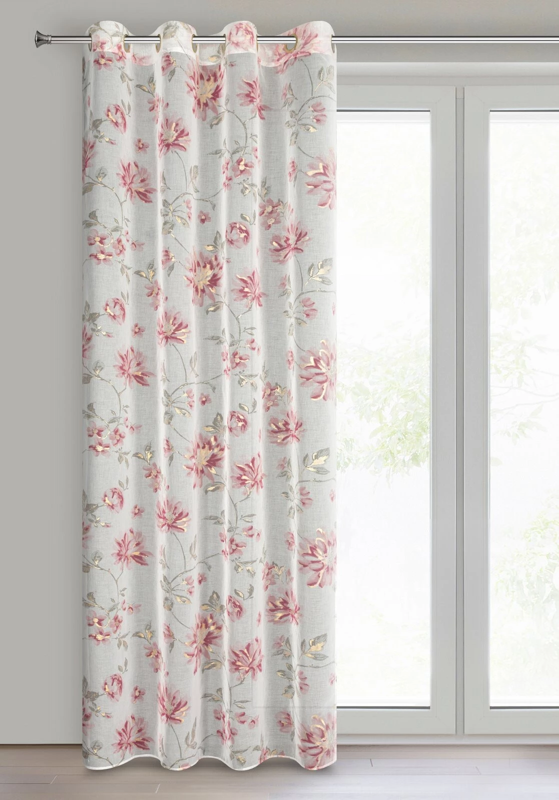 Zasłona z motywem botanicznym z błyszczącym nadrukiem szerokość: 140 cm, długość: 250 cm, kolor: biały, Gramatura: 70 GSM, Skład: 100% poliester
