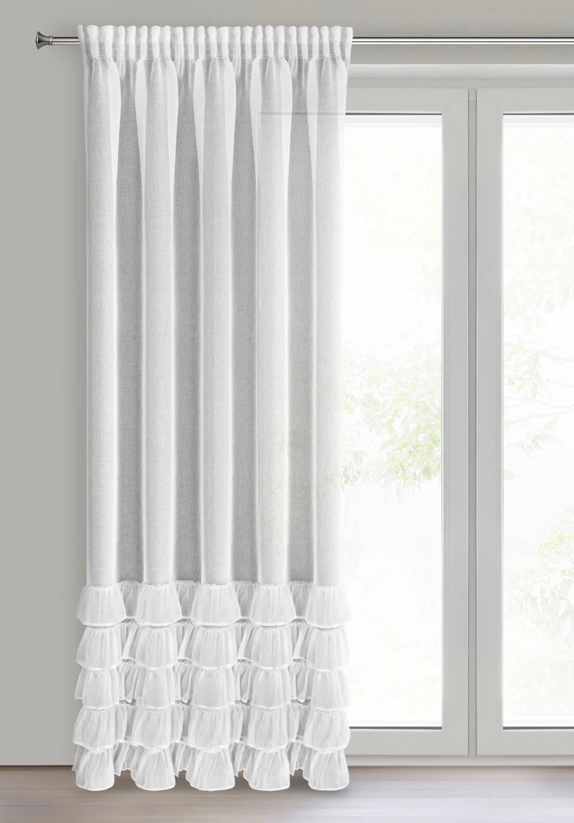 Firana gotowa zdobiona w dolnej części falbankami szerokość: 140 cm, długość: 250 cm, kolor: biały, Gramatura: 70 GSM, Skład: 100% poliester