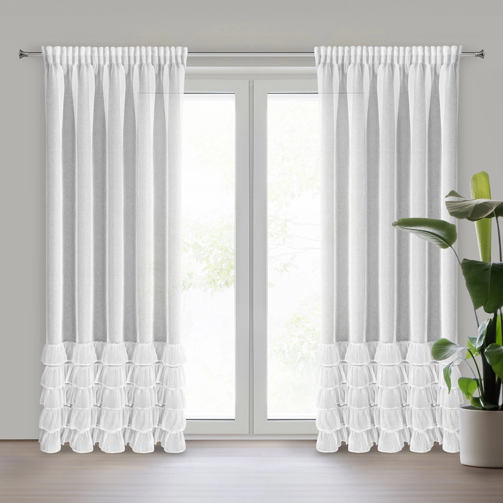 - Firana gotowa zdobiona w dolnej części falbankami szerokość: 140 cm, długość: 250 cm, kolor: biały, Gramatura: 70 GSM, Skład: 100% poliester