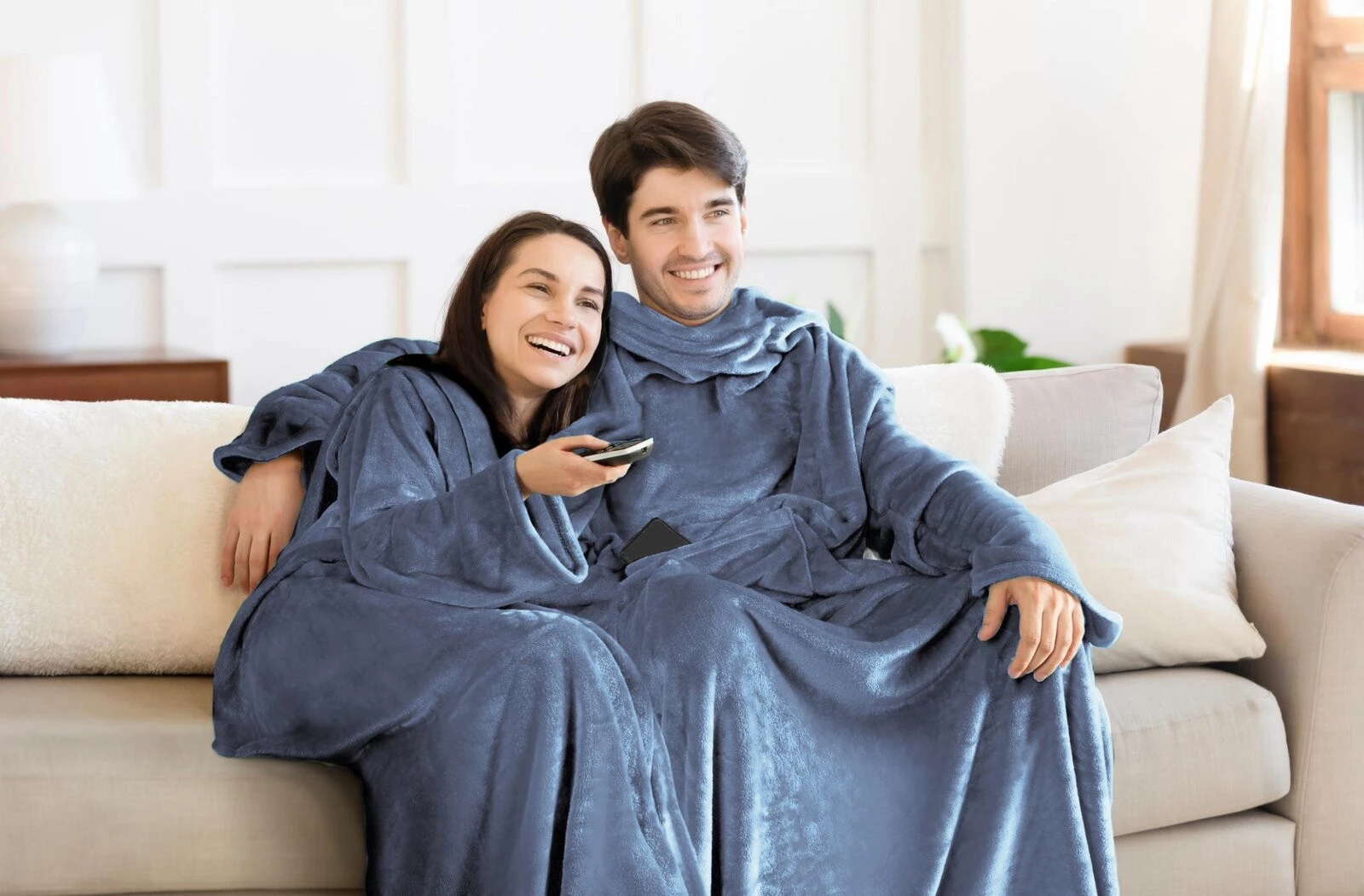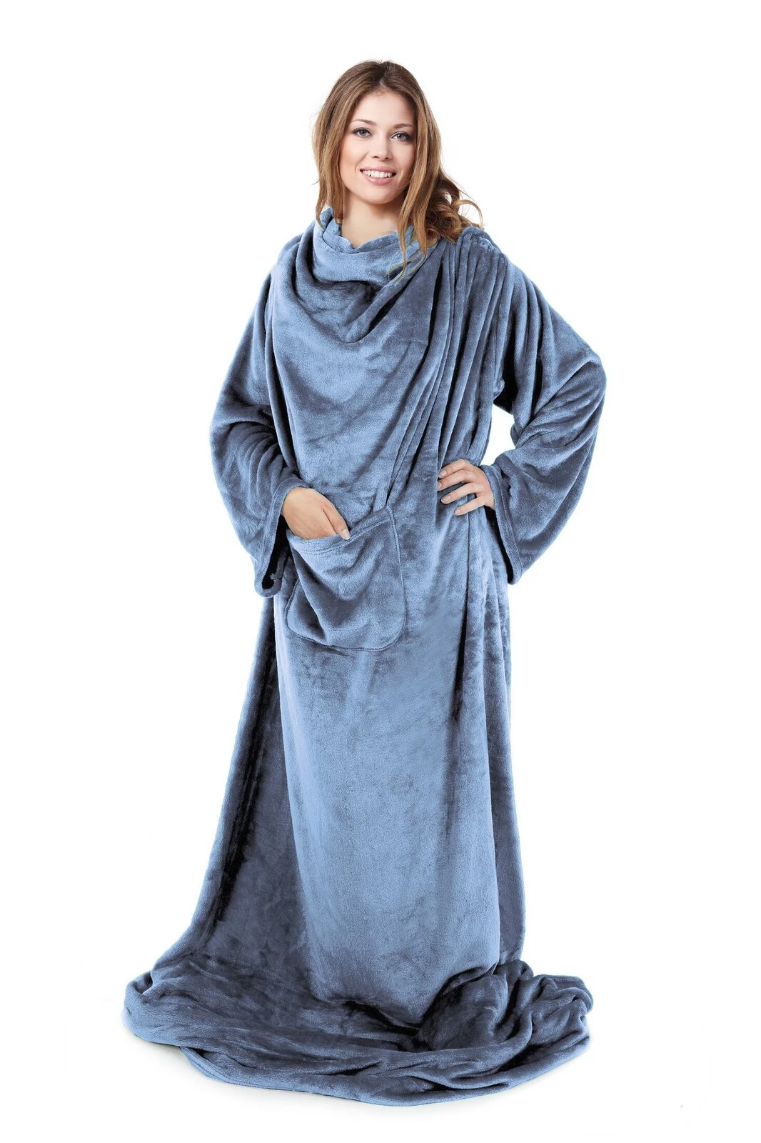 - Koc typu flano z kieszenią i rękawami, idealny na seanse telewizyjne szerokość: 150 cm, długość: 180 cm, kolor: ciemnoniebieski, Gramatura: 240 GSM, Skład: 100% poliester